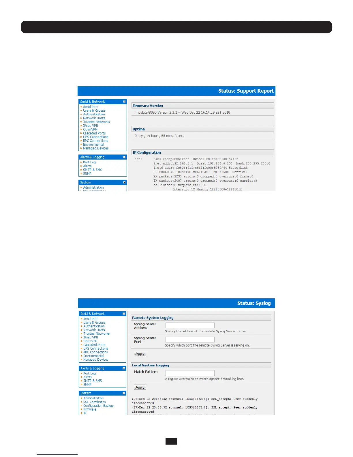 The Support Report provides useful status information that will assist the Tripp Lite technical support team to resolve any