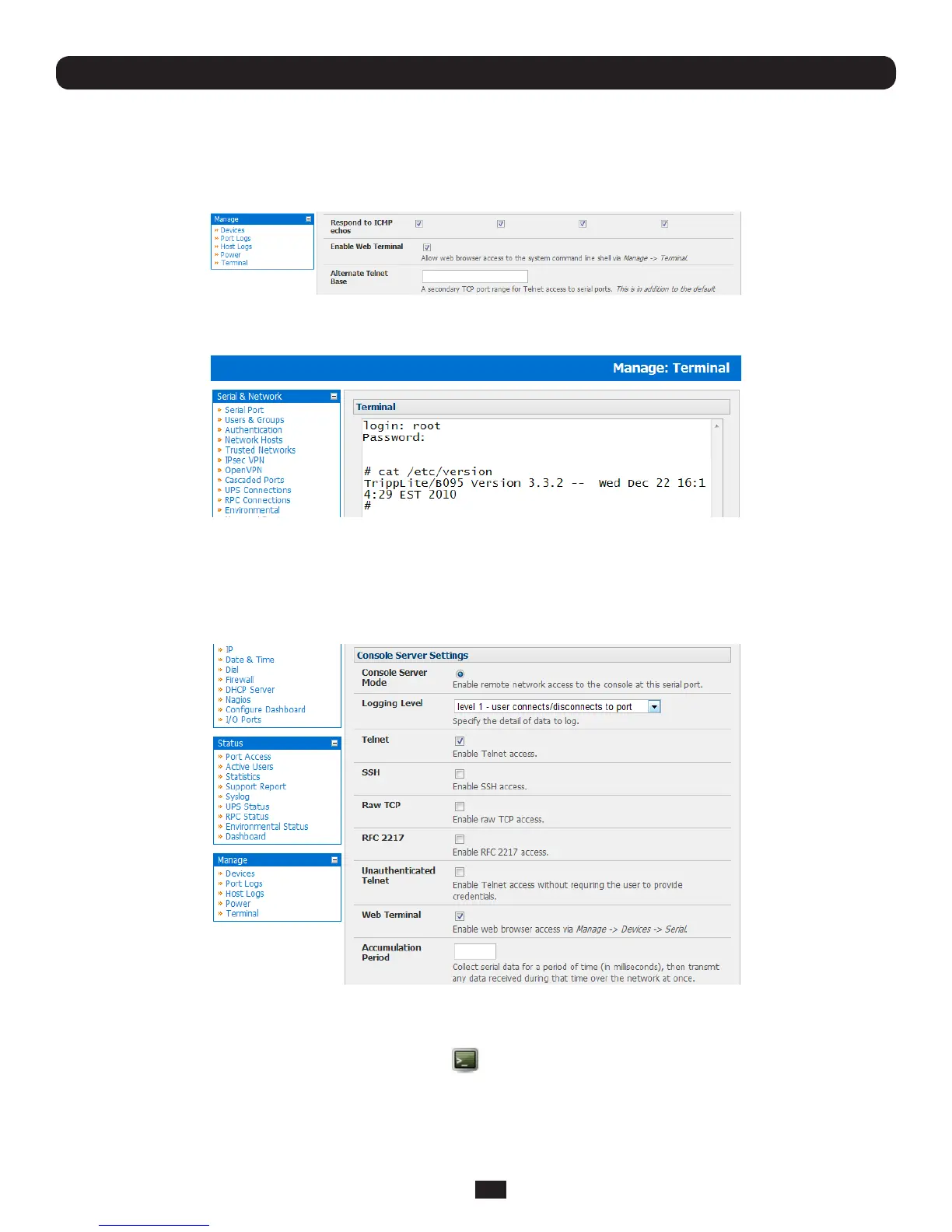 • SelectManage: Terminal to display the Web Terminal from which you can log in to the Console Server command line