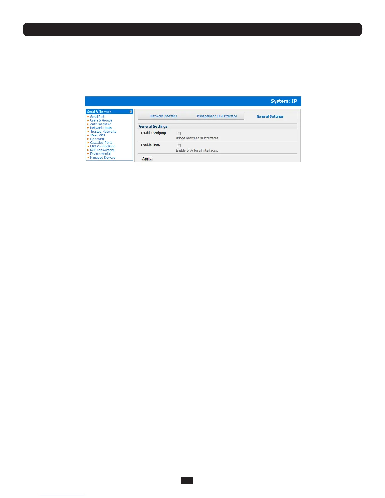 • SelectEnable Bridging on the System: IP General Settings menu