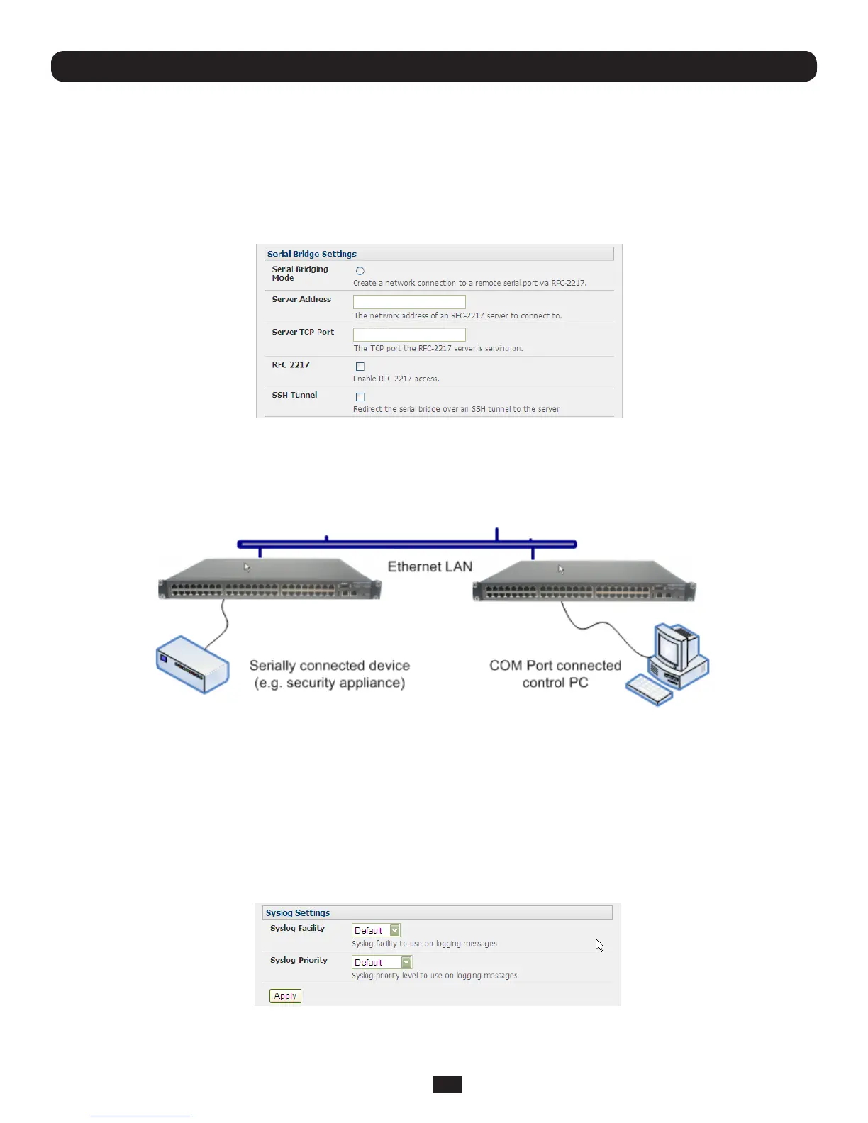 • SelecttheSyslog Facility/Priority fields to enable logging of traffic on the selected serial port to a syslog server; and to