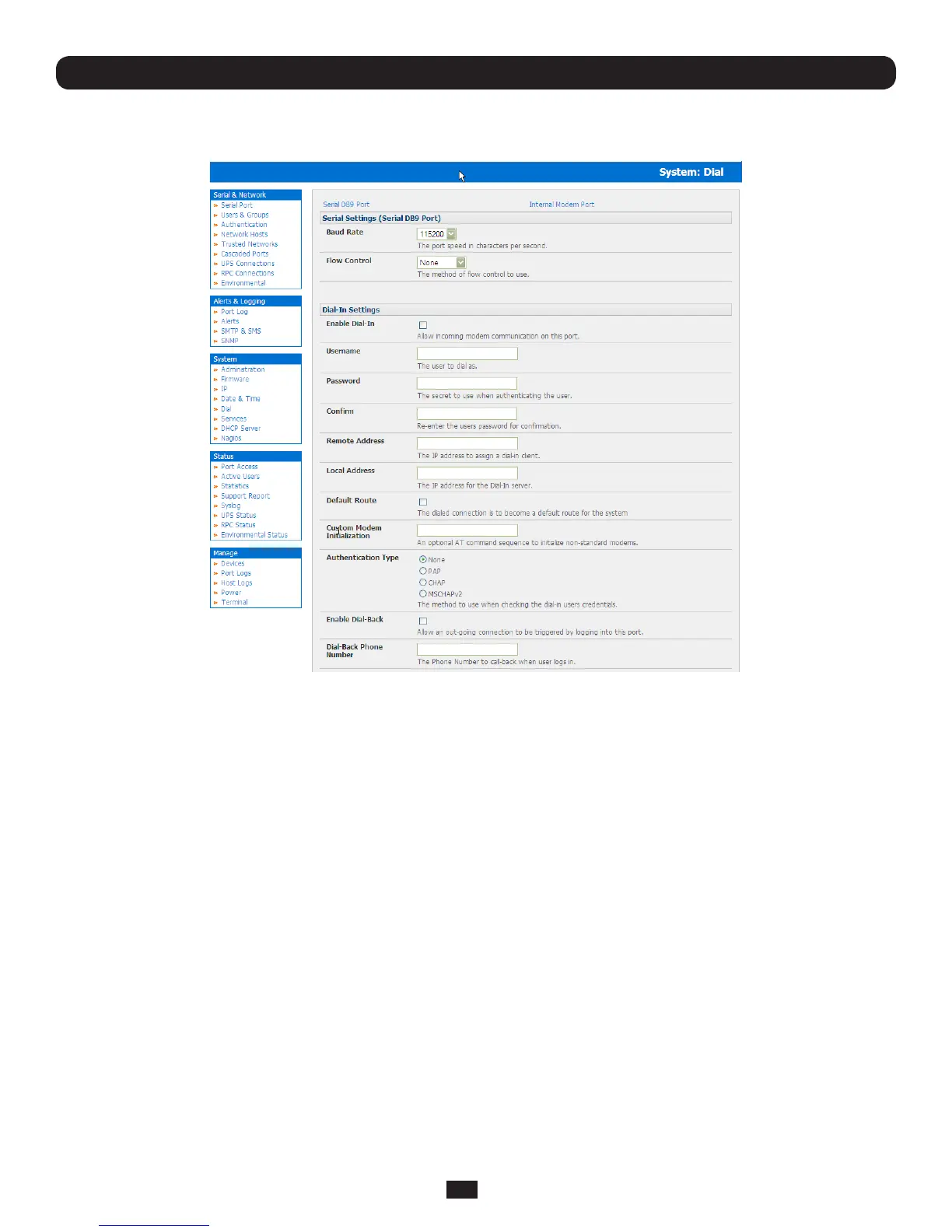 • SelecttheSystem: Dialmenuoptionandtheporttobecongured(Serial DB9 Port or Internal Modem Port)