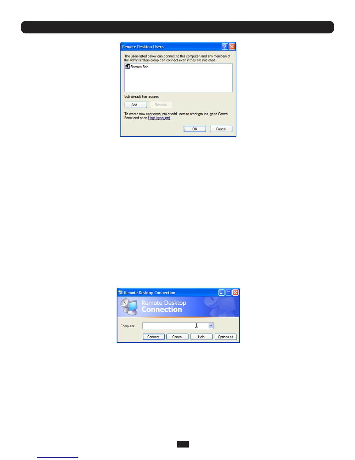Note: If you need to set up new users for Remote Desktop access, open User Accounts in the Control Panel and proceed