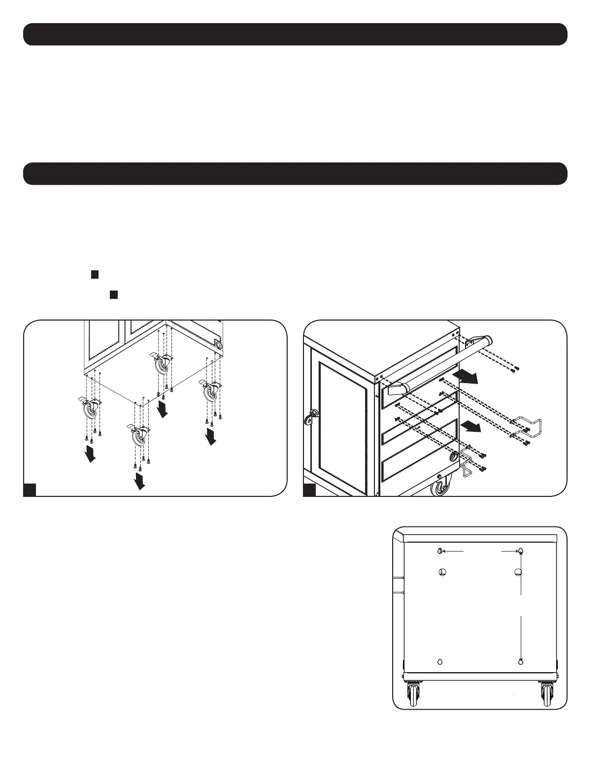 Para retirar las ruedas y la manija de aplicaciones fijas o instaladas en pared, extraiga los 16 tornillos M6 que fijan las cuatro ruedas (cuatro por