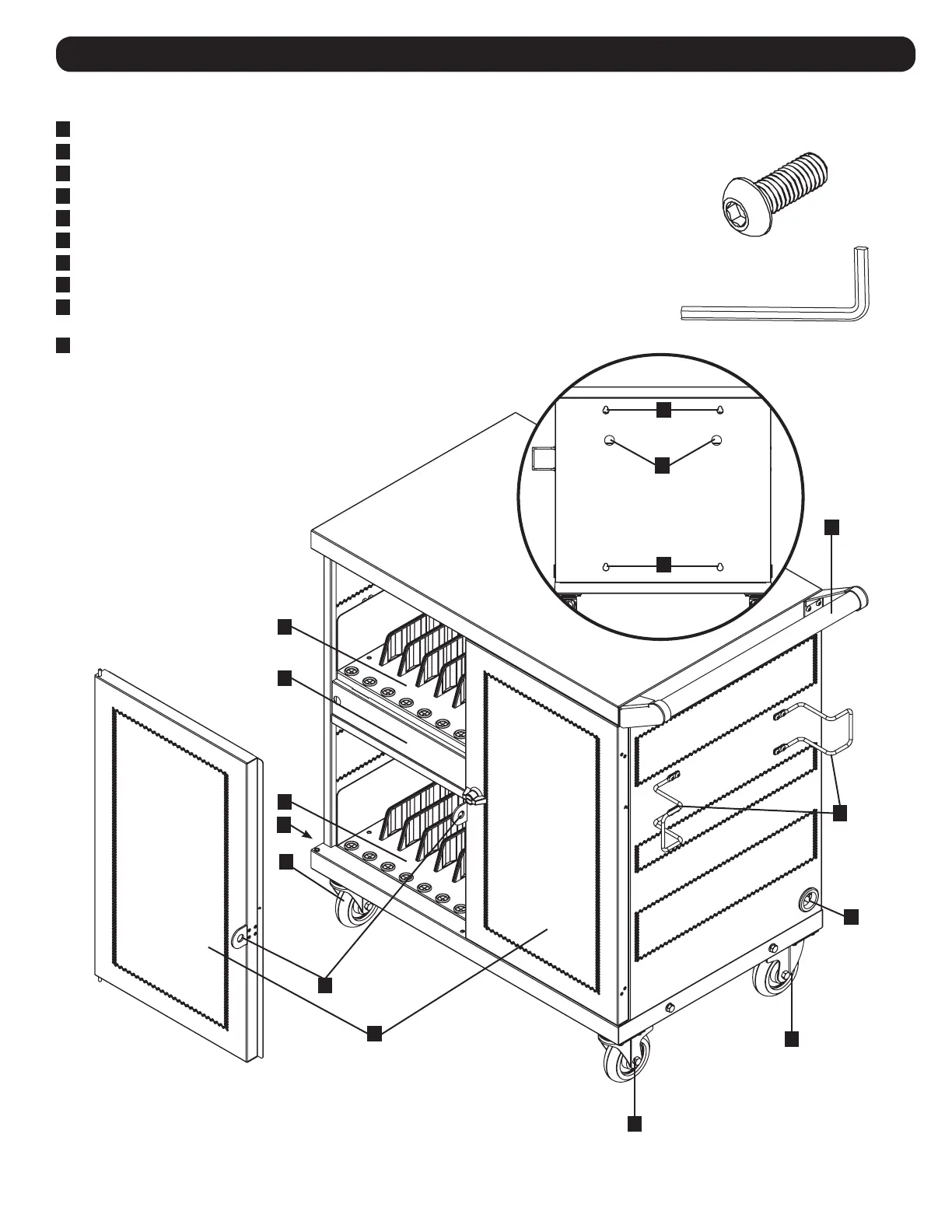 Étagères de rangement réglables (chaque étagère peut recevoir jusqu'à 16 appareils)