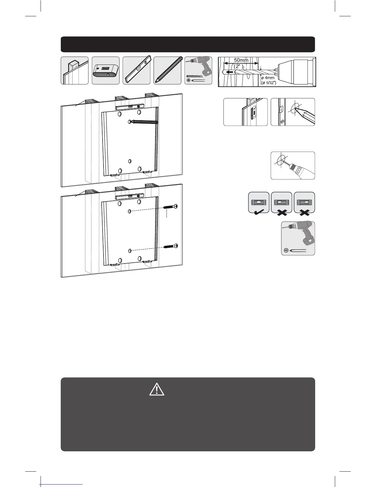 • Make sure that mounting screws are anchored into the center of the studs.