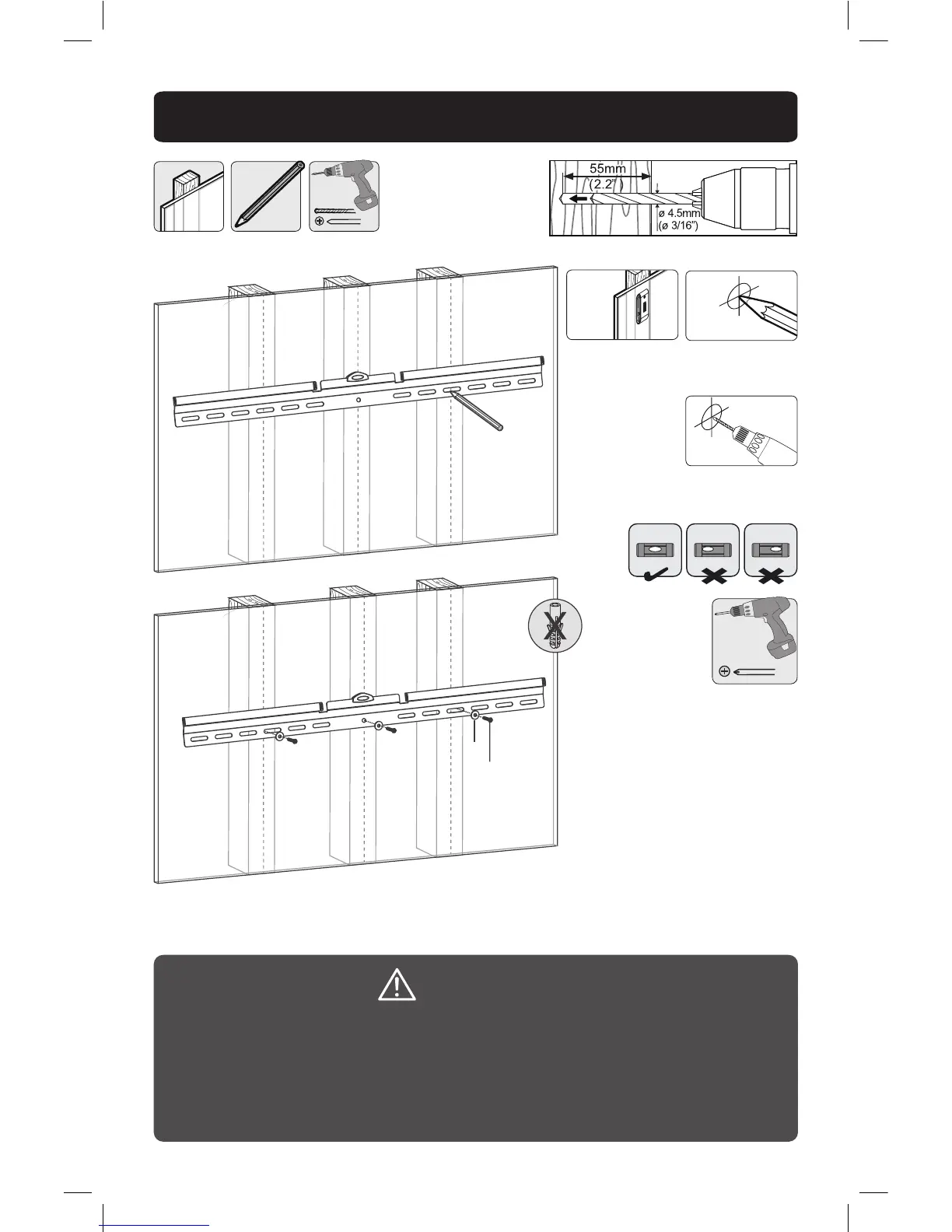 • Make sure that mounting screws are anchored into the center of the studs.