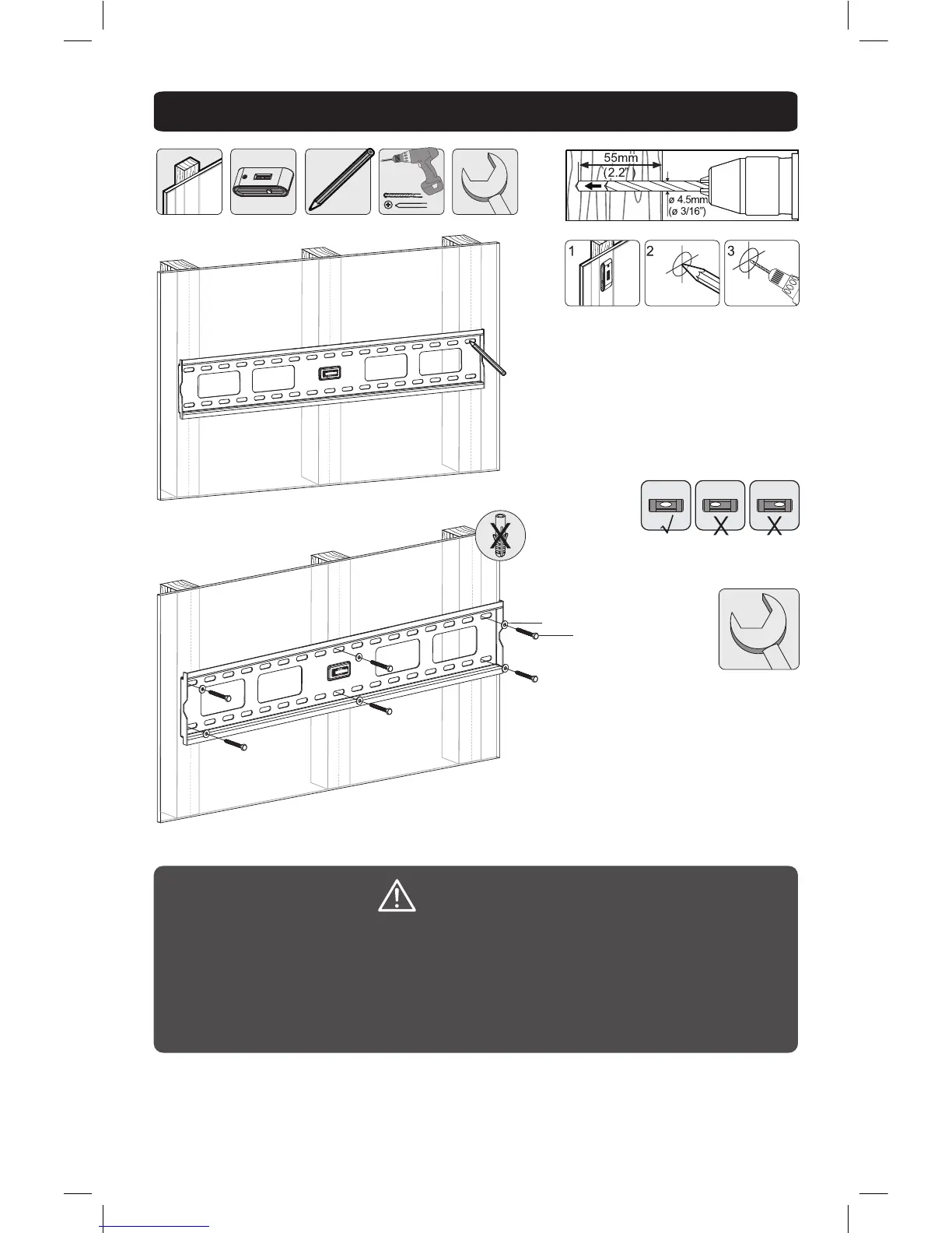 • Make sure that mounting screws are anchored into the center of the studs.