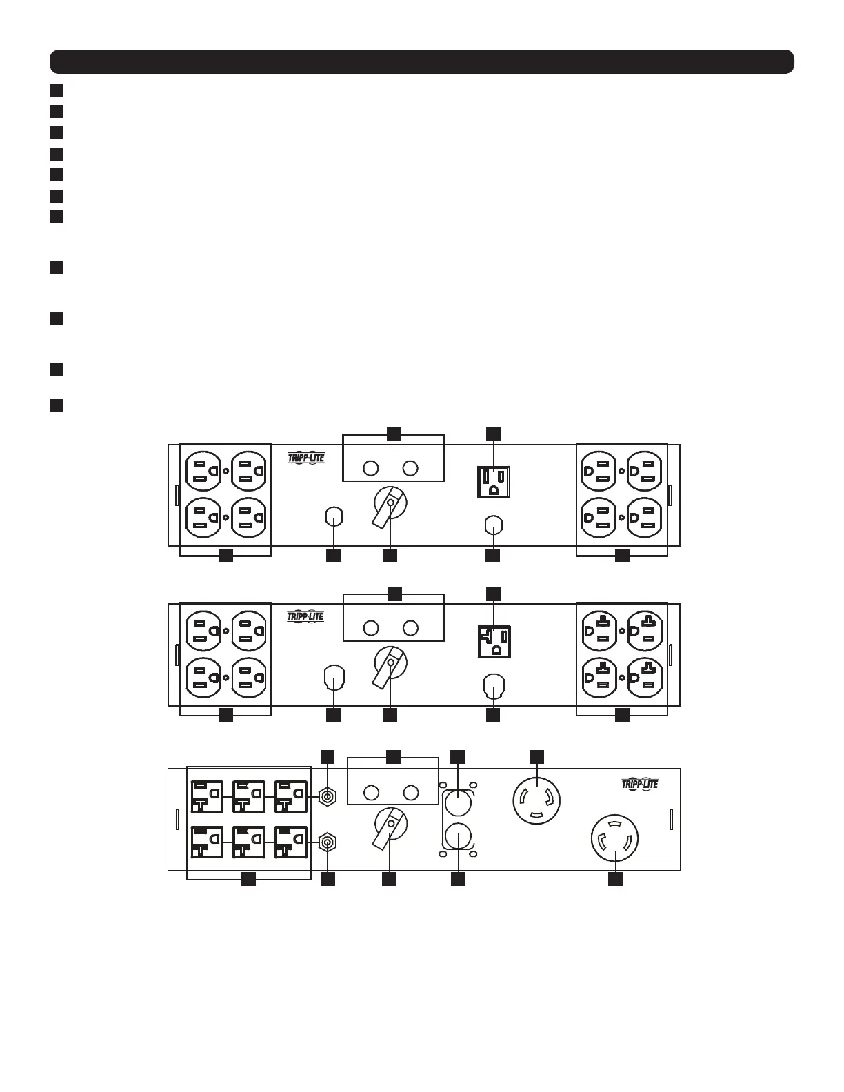 Utility Source Input: Connects to the utility power source. Models PDUB15, PDUB20 and PDUB30 each have a fixed input cord and