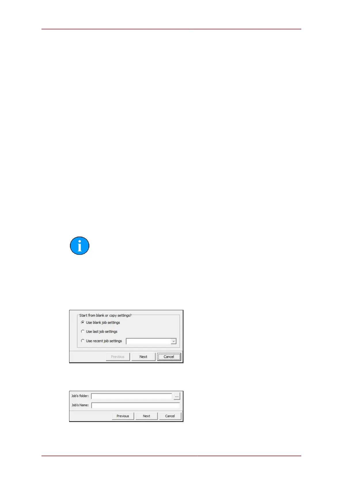 The first screen lets the user select the Settings from a Previous/Last Job, the most Recent