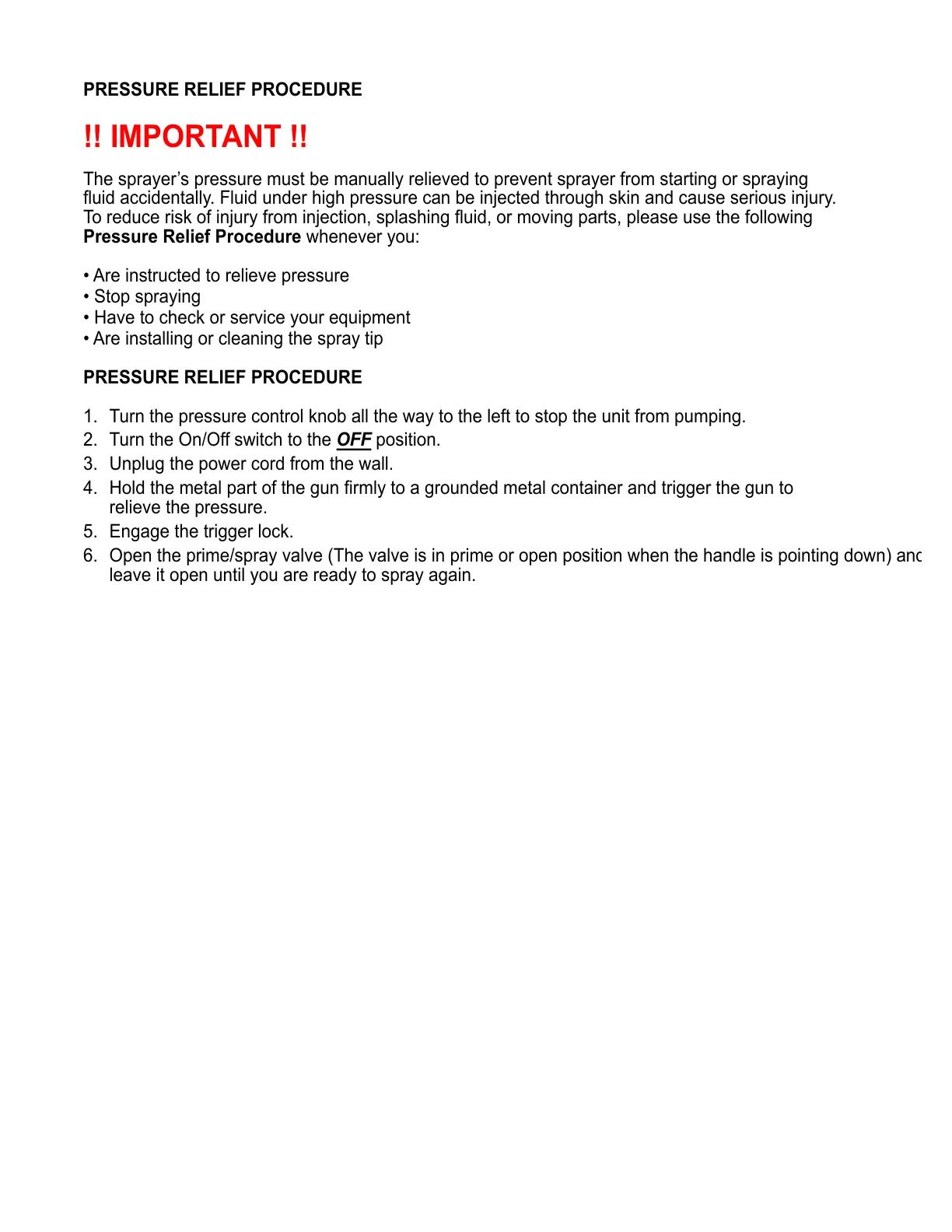 The sprayer’s pressure must be manually relieved to prevent sprayer from starting or spraying