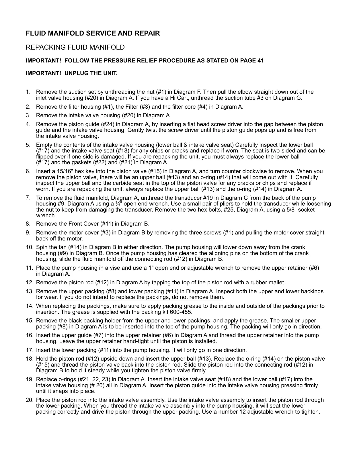 To remove the uid manifold, Diagram A, unthread the transducer #19 in Diagram C from the back of the pump