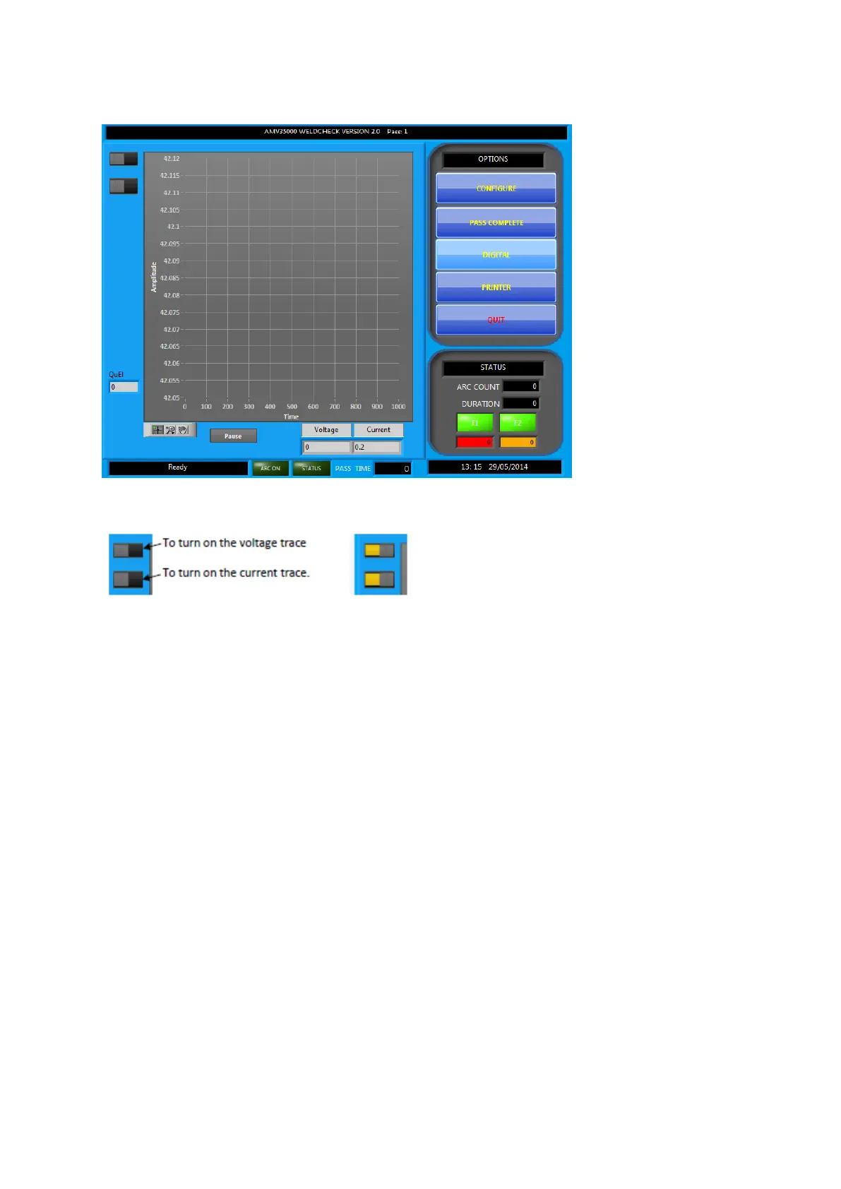 This changes the main display so that the welding waveform can be analysed. Use the button at the