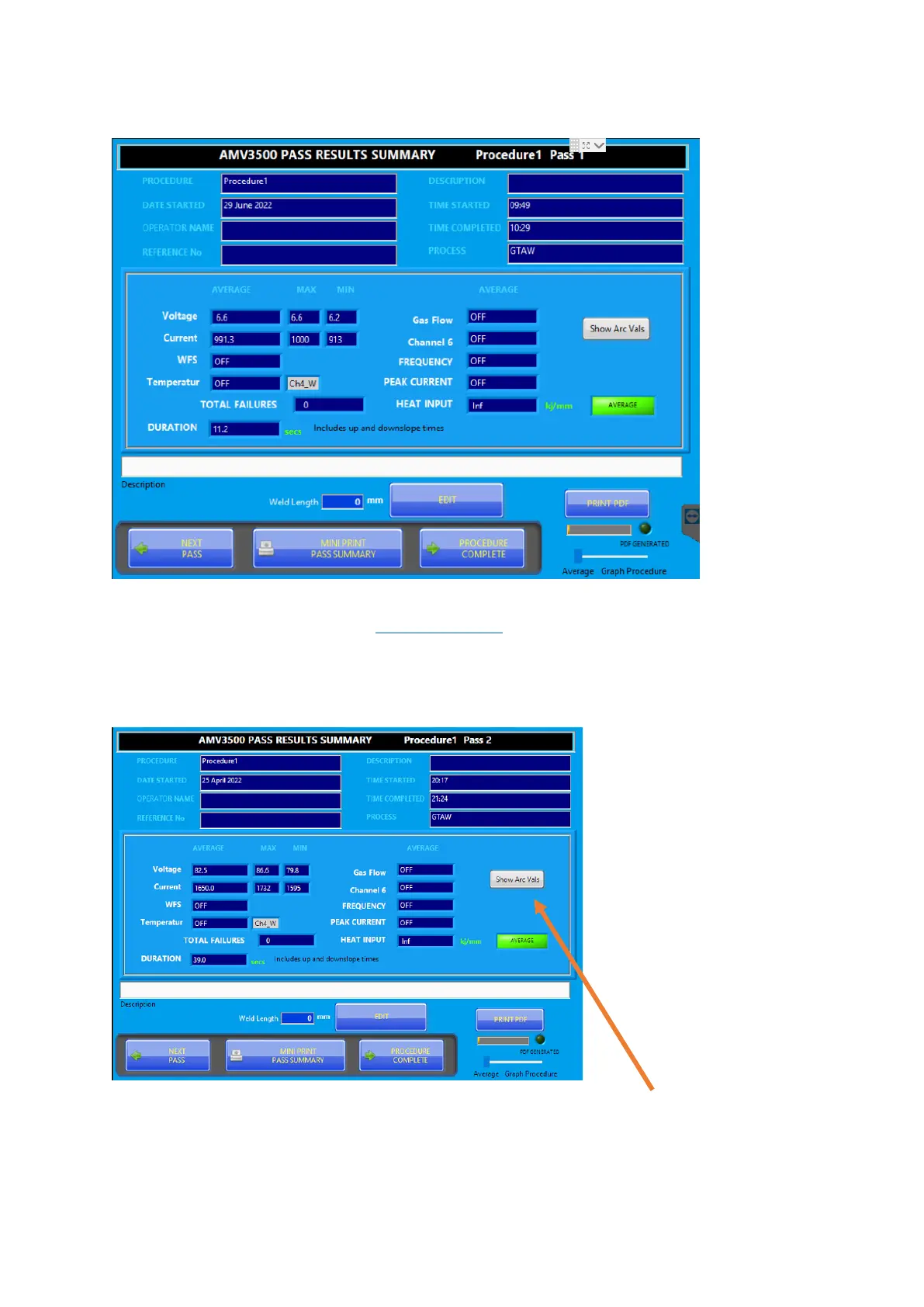 If there are a number of arcs in the pass these can be viewed through the Show Arc Vals: