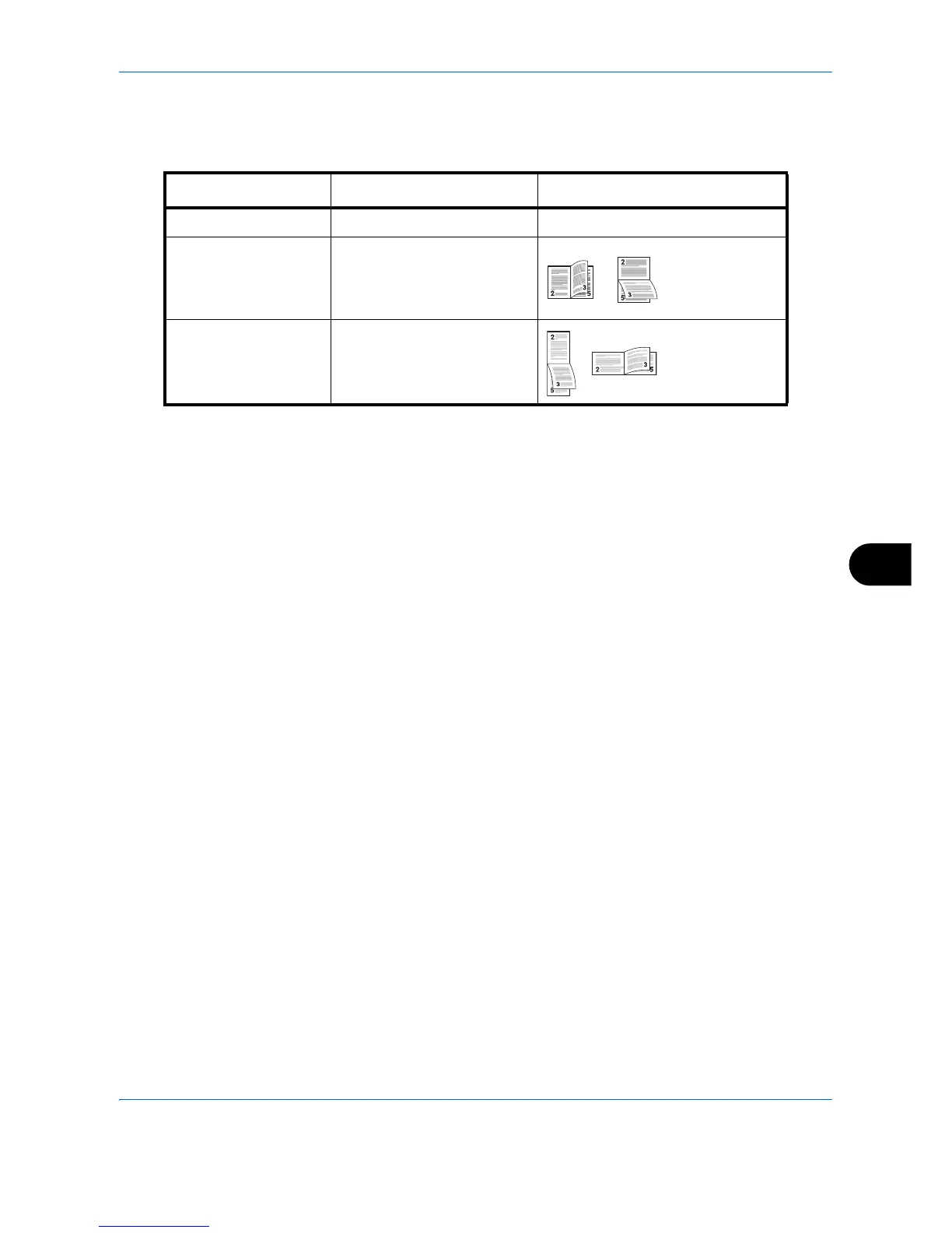 Select the binding orientation for duplex mode. The table below shows the available settings.