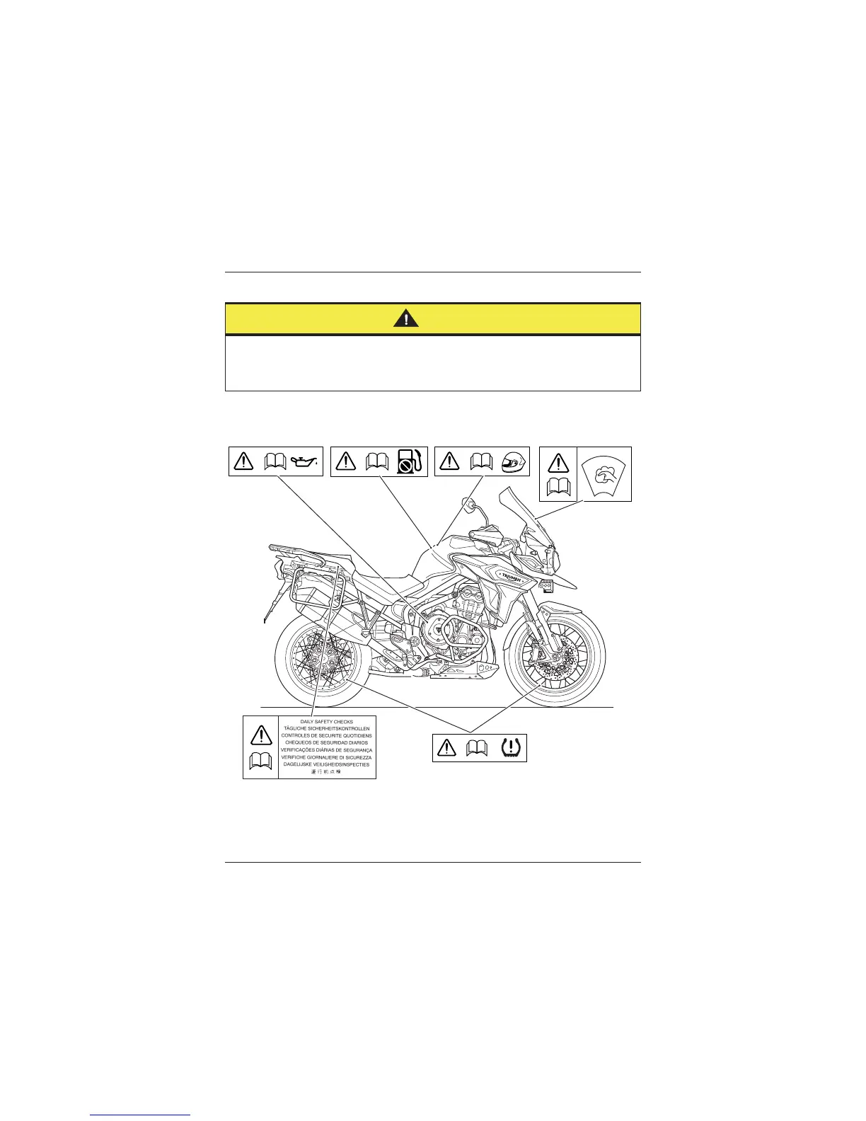 All warning labels and decals, with the exception of the Running-in label, are fitted