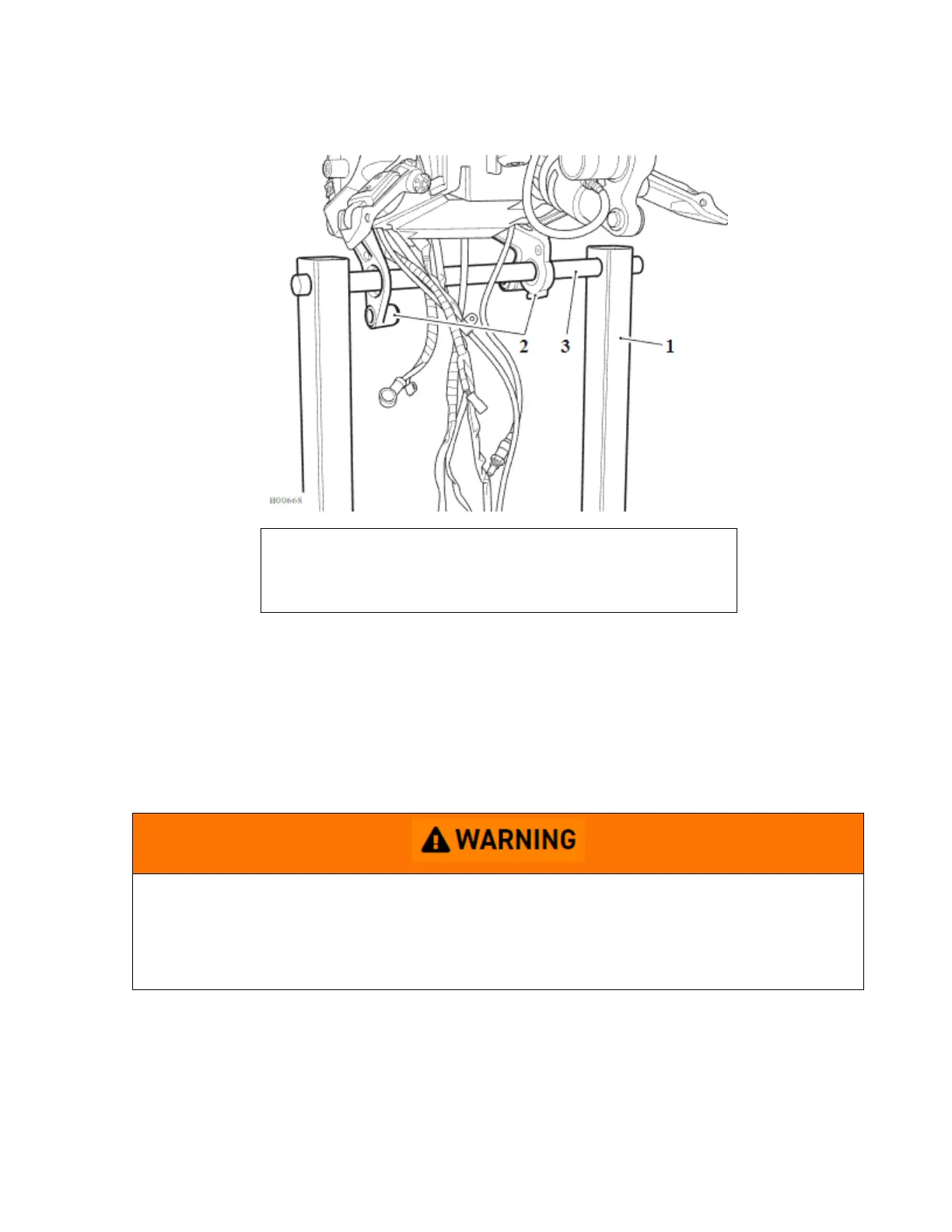 46. Fit the support bar of service tool T3880505 to the frame through the swinging arm