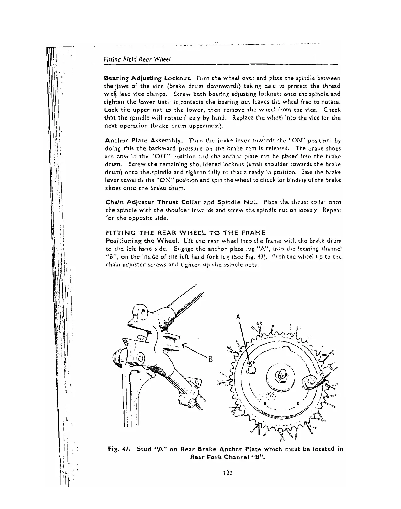 Positioning the Wheel. Lift the rear wheel into the frame with the brake drum