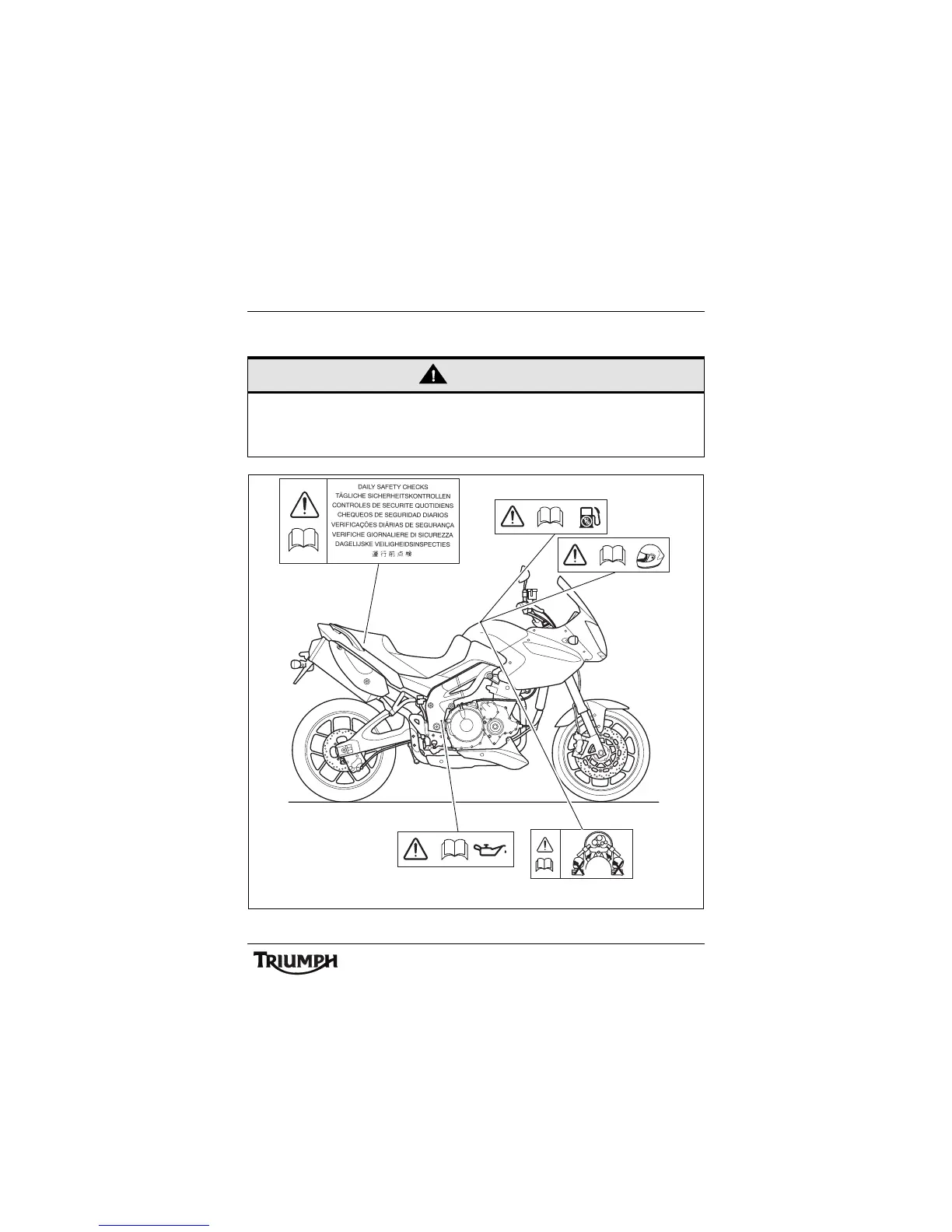 All warning labels and decals, with the exception of the Running-in label, are fitted to the