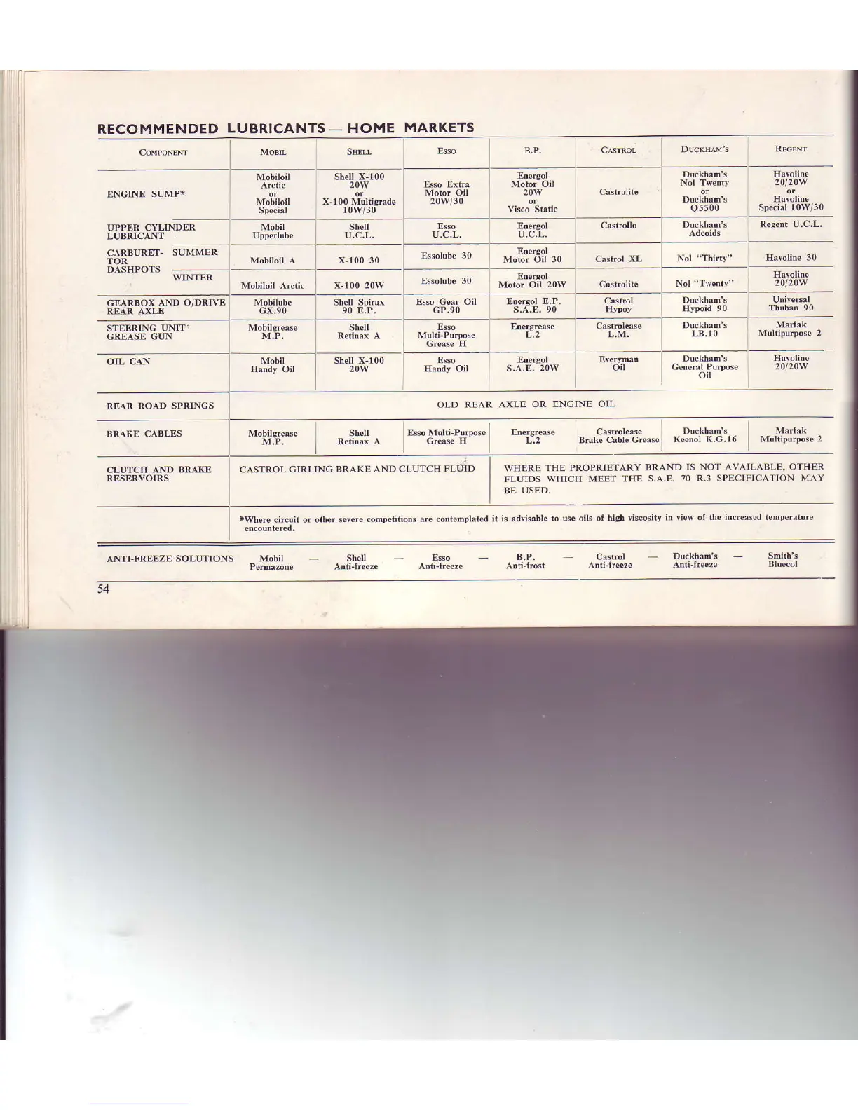 Triumph TR4 - RECOMMENDED LUBRICANTS - HOME MARKETS; Lubricant Recommendations by Component