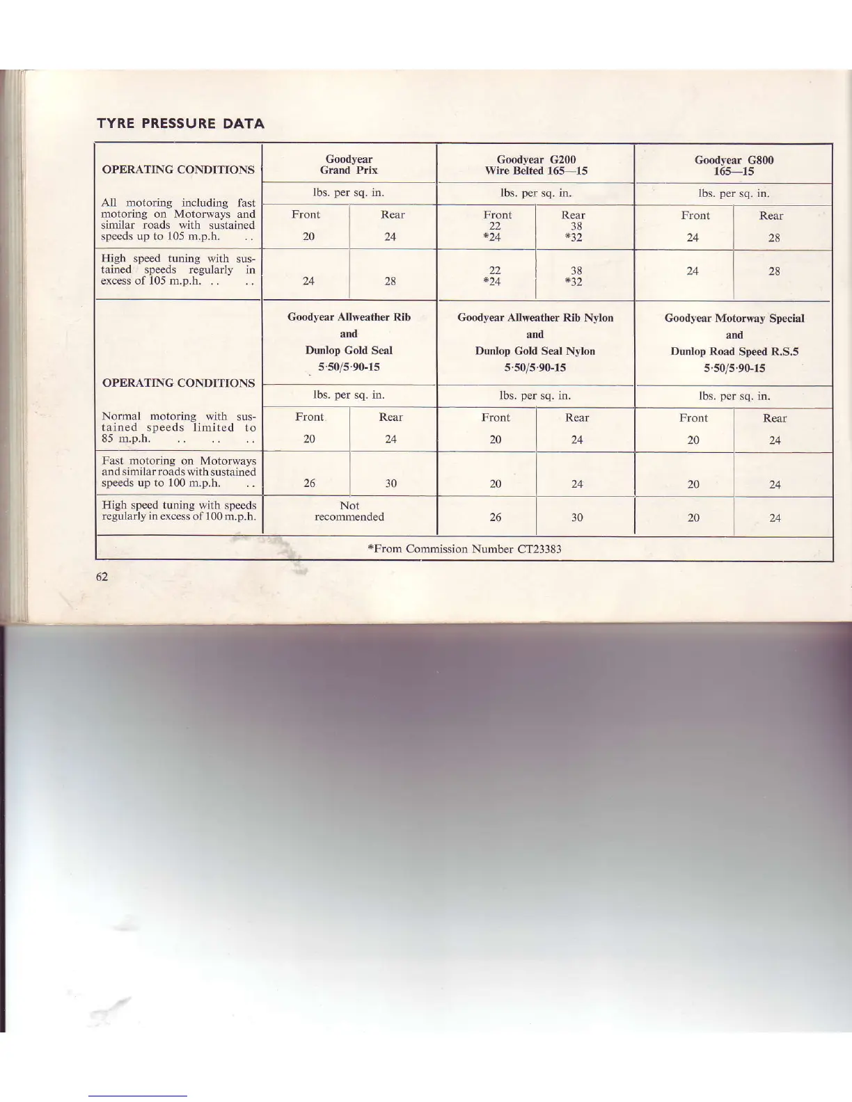 Triumph TR4 - TYRE PRESSURE DATA; Operating Conditions and Tyre Pressure Recommendations