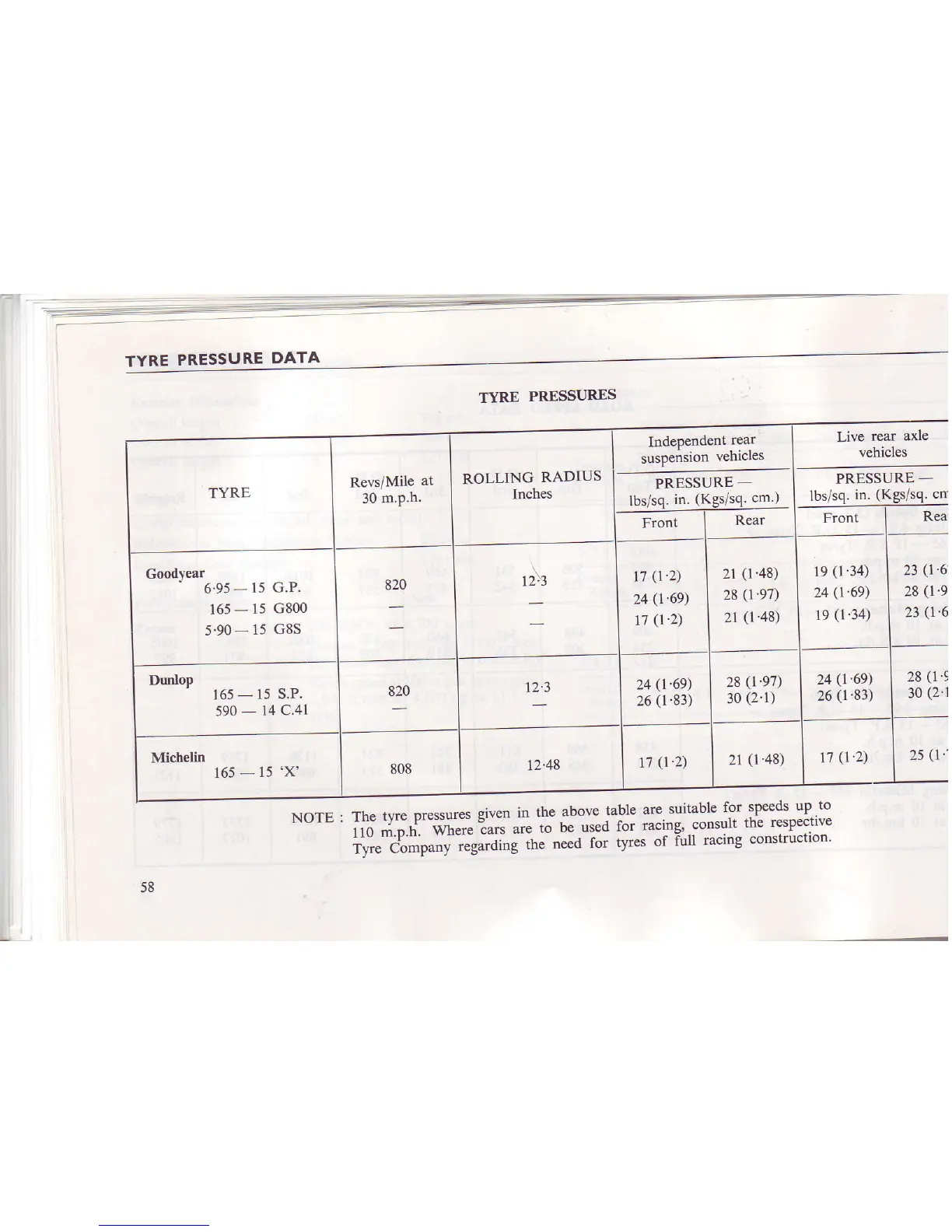 Triumph TR4A - Tyre Pressure Data; Recommended Tyre Pressures