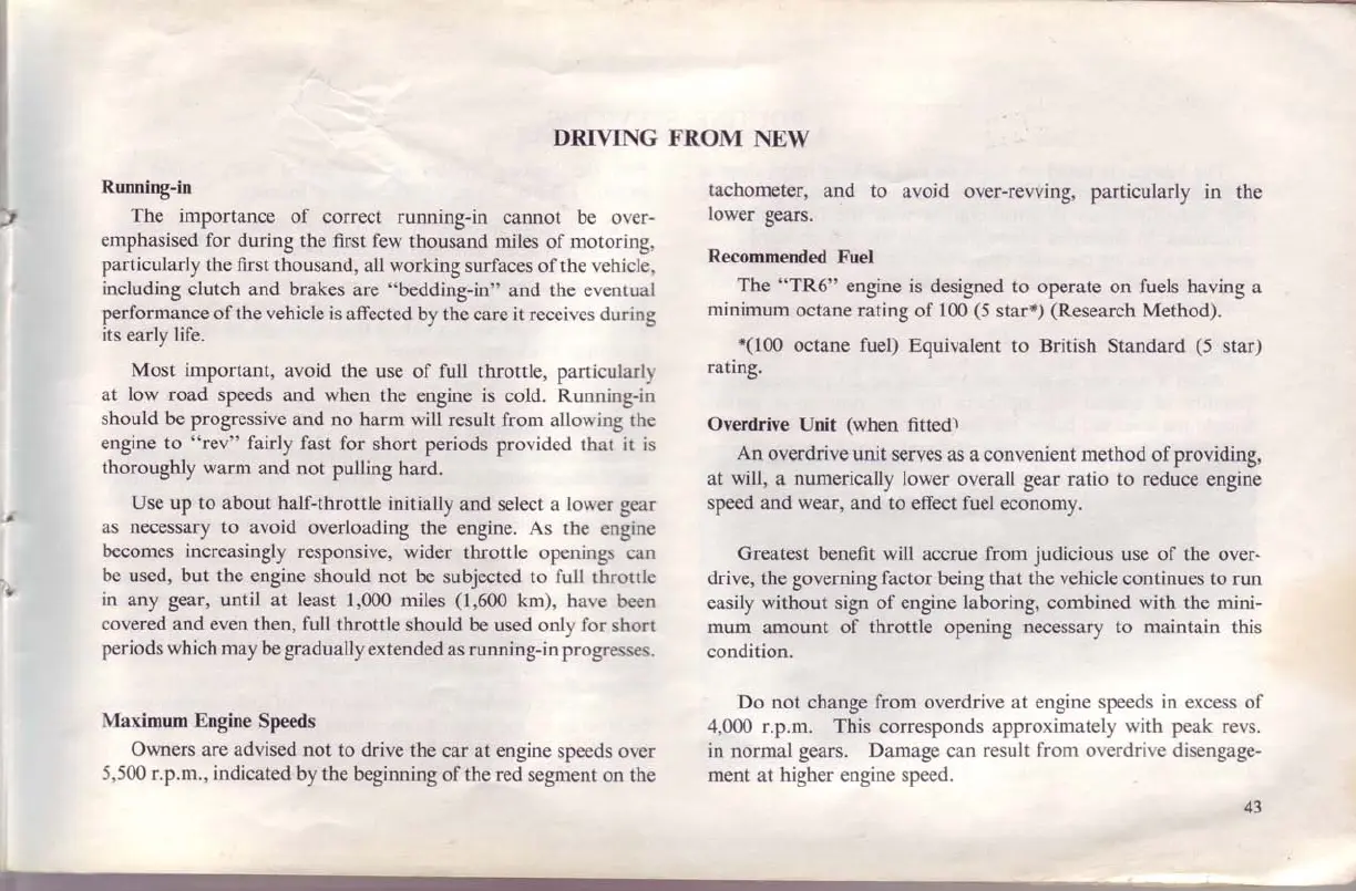 Triumph TR6 - Driving from New; Running-in Procedure Guidelines; Maximum Engine Speed Limits; Recommended Fuel Type