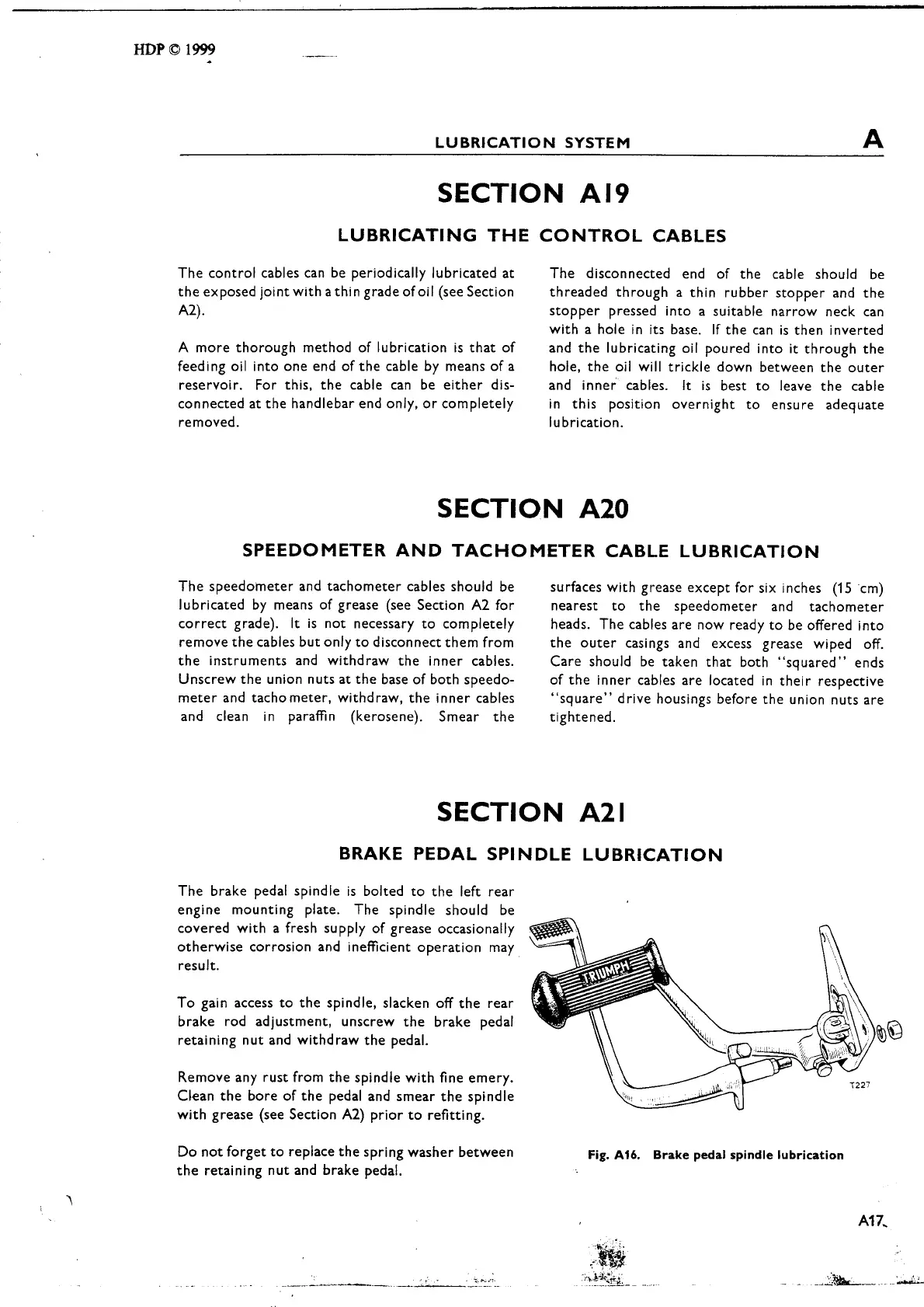 Triumph Trident T150R - Lubricating the Control Cables; Speedometer and Tachometer Cable Lubrication; Brake Pedal Spindle Lubrication