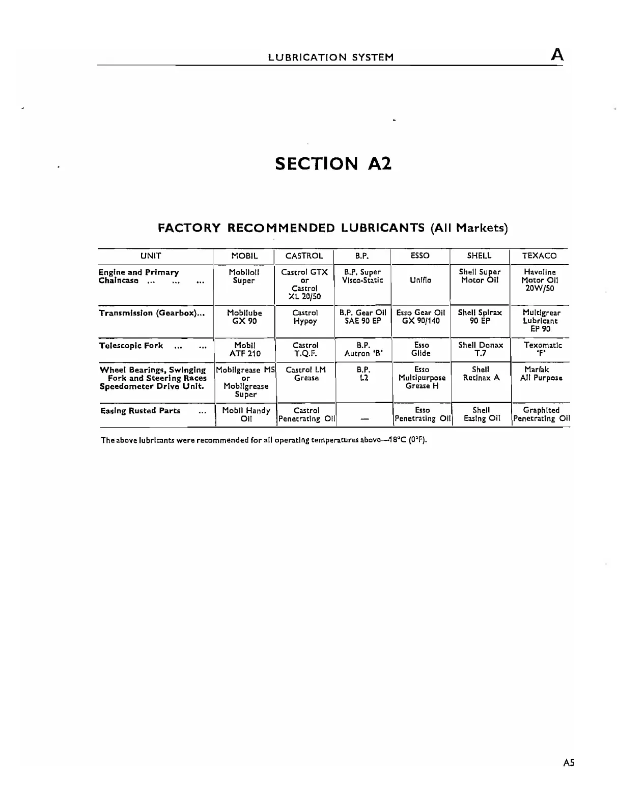 Triumph Trident T160 - A2 TABLE OF RECOMMENDED LUBRICANTS