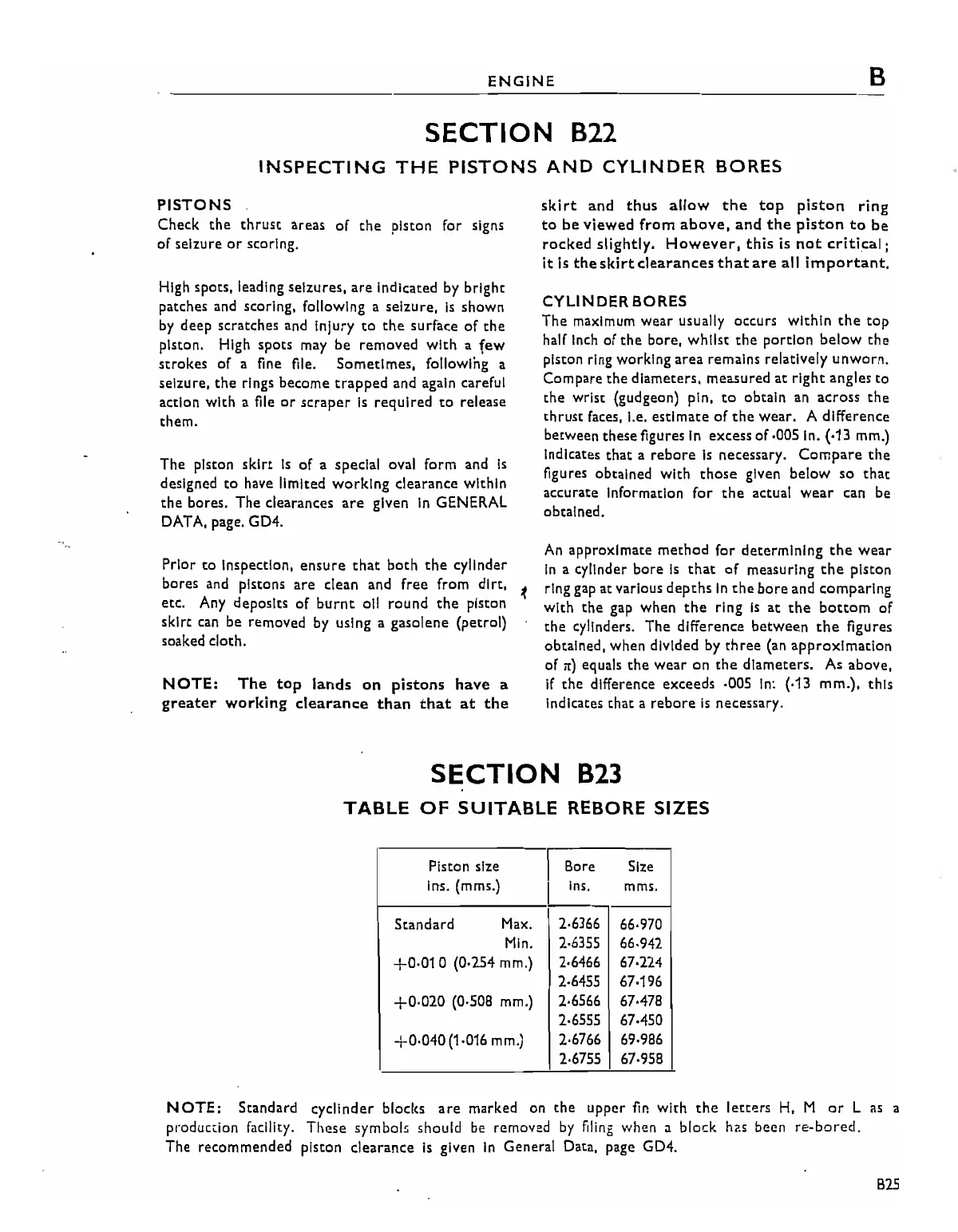 Triumph Trident T160 - B22 INSPECTING THE PISTONS AND CYLINDER BORES; B23 TABLE OF SUITABLE REBORE SIZES