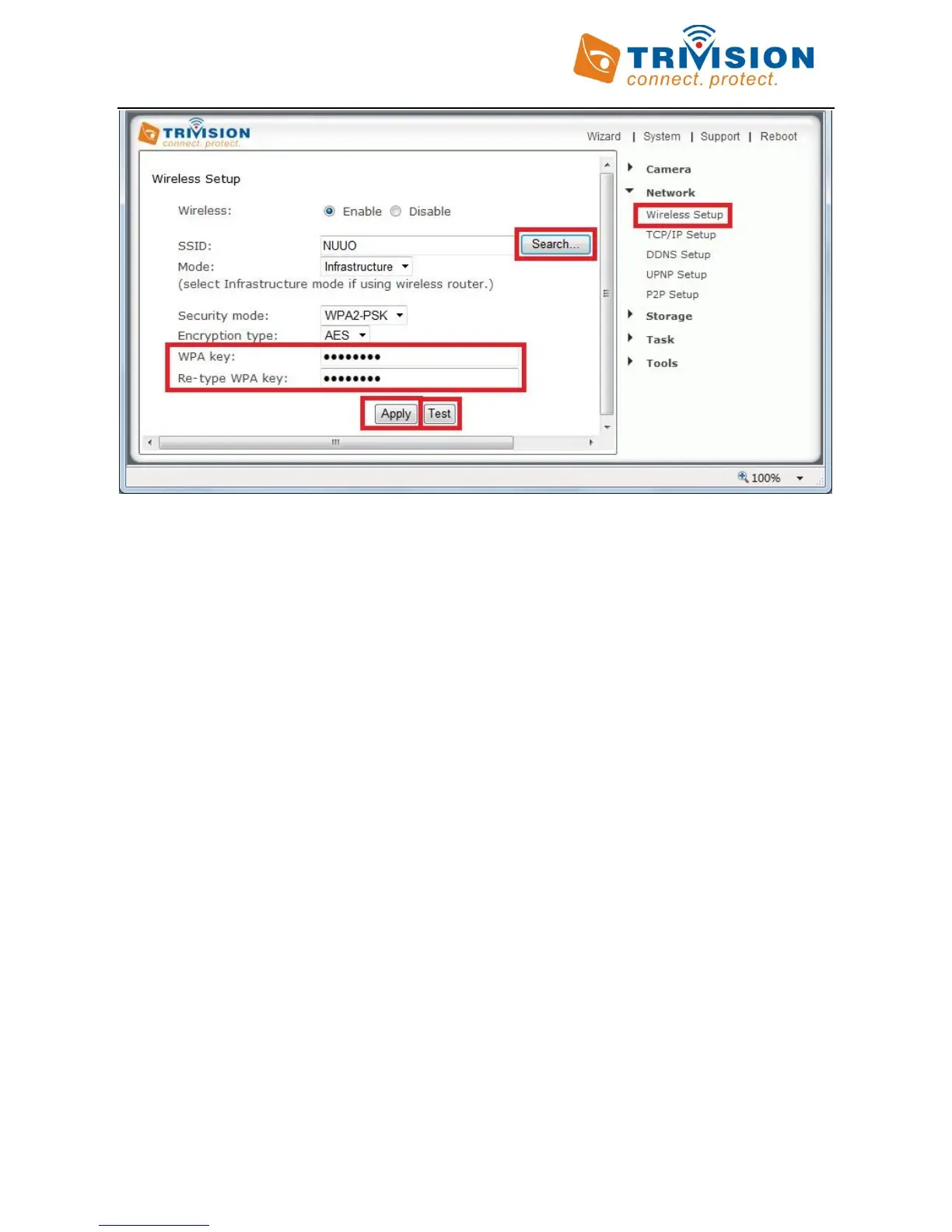 the test reports “no wireless connection”, please double check your WPA key (password” and refer both to the