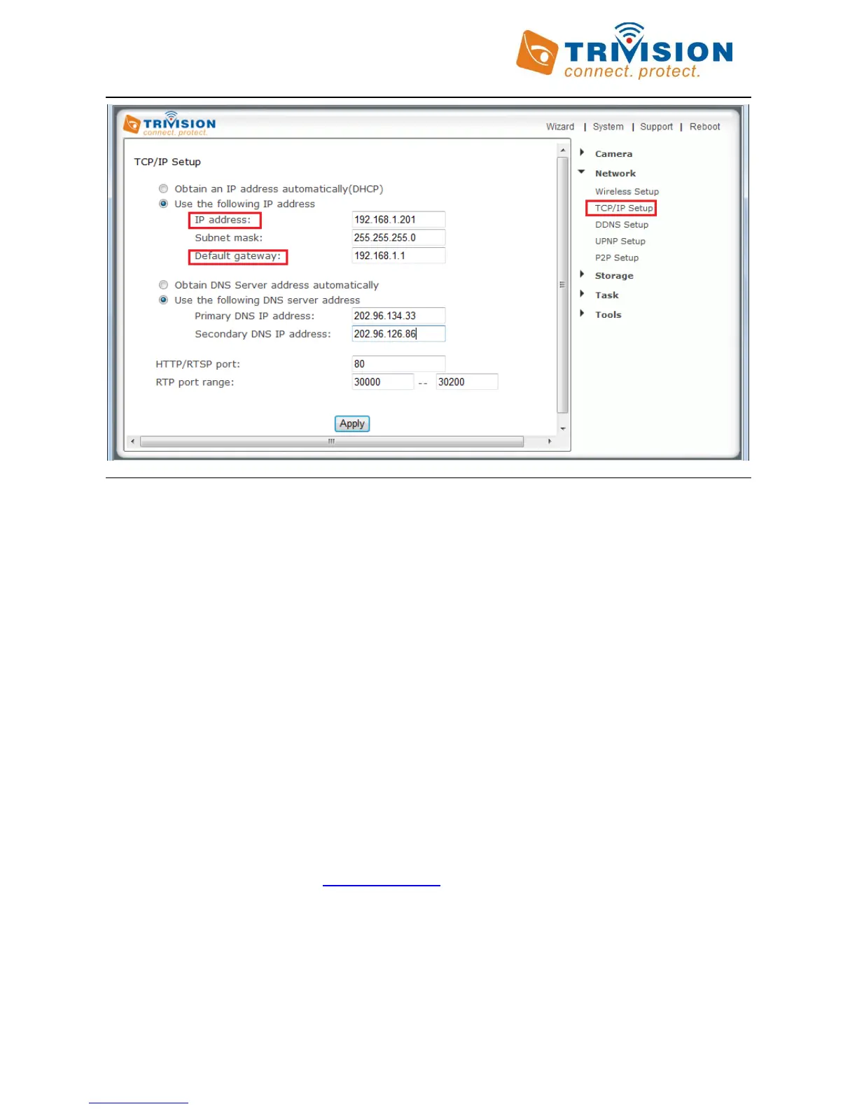 After you click on “Apply”, you need to log in to the camera at the address you just picked. Remember to add the