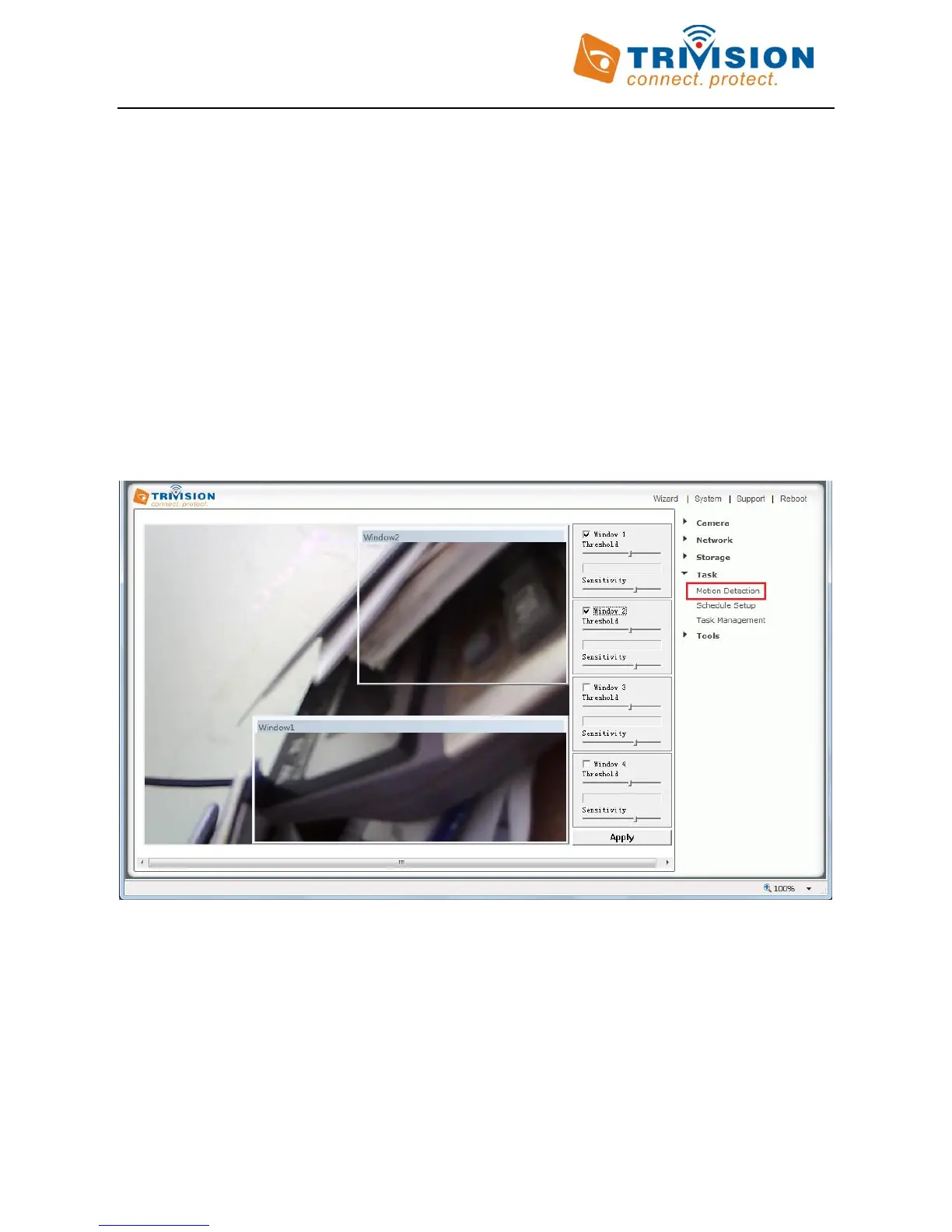 area. The “Motion Detection” menu allows you to designate up to 4 separate windows with individually adjustable