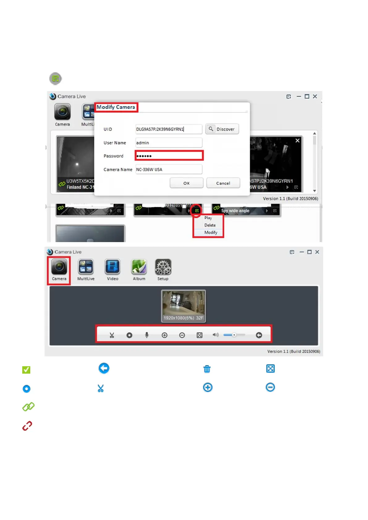Click on icon to play/delete/modify camera.