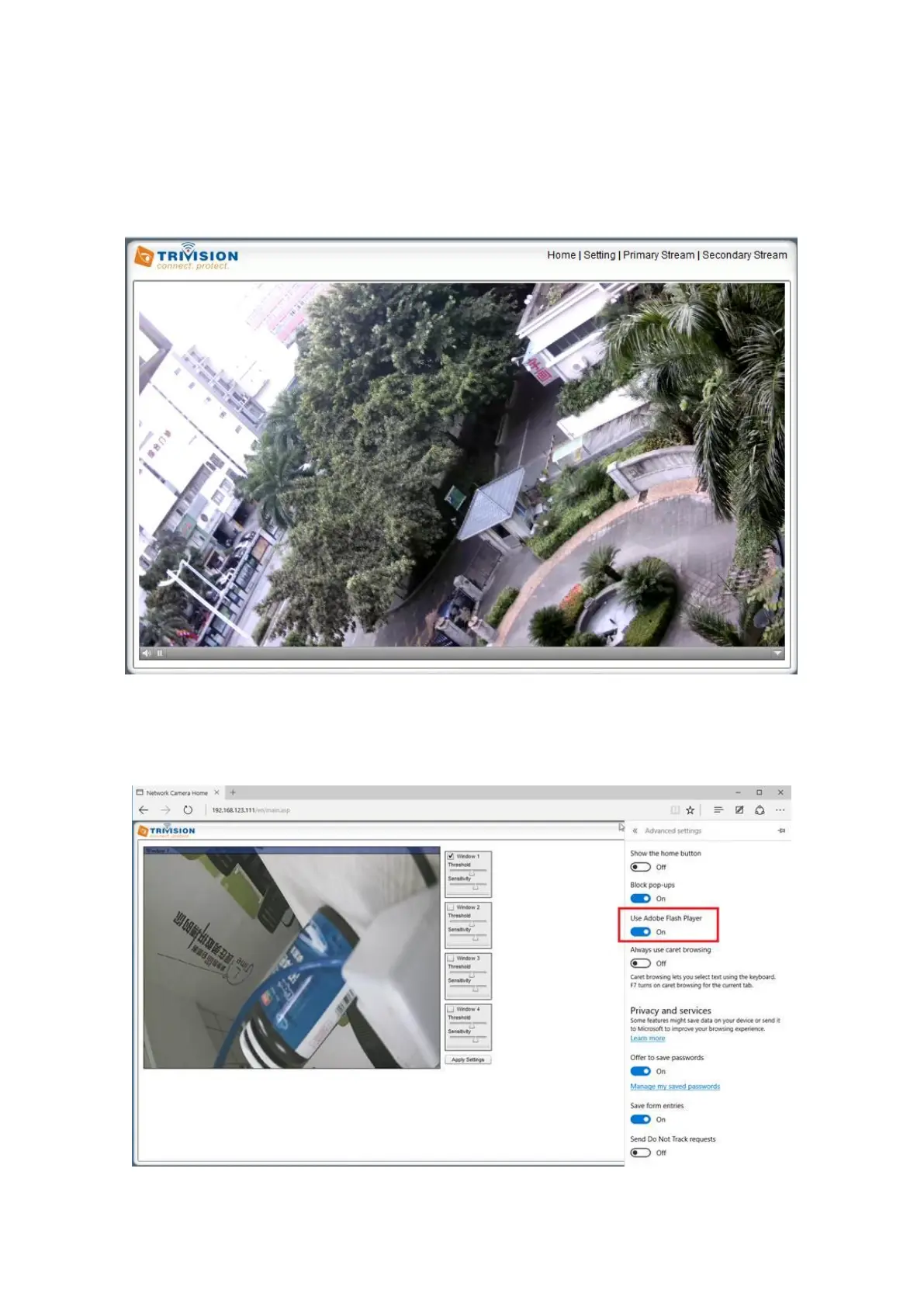 Make sure to enable the Flash player function in EDGE browser: Click “setting” in EDGE browser-click “view
