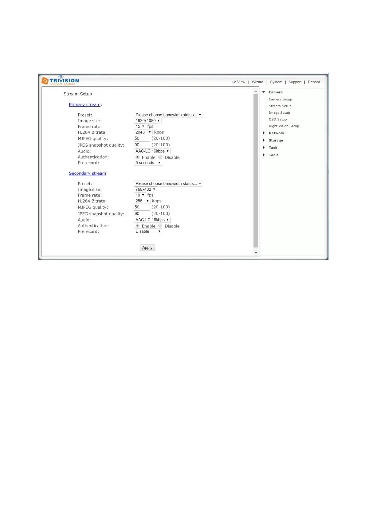 Click on Stream Setup under the Camera Menu to change the streaming settings for your camera. This is