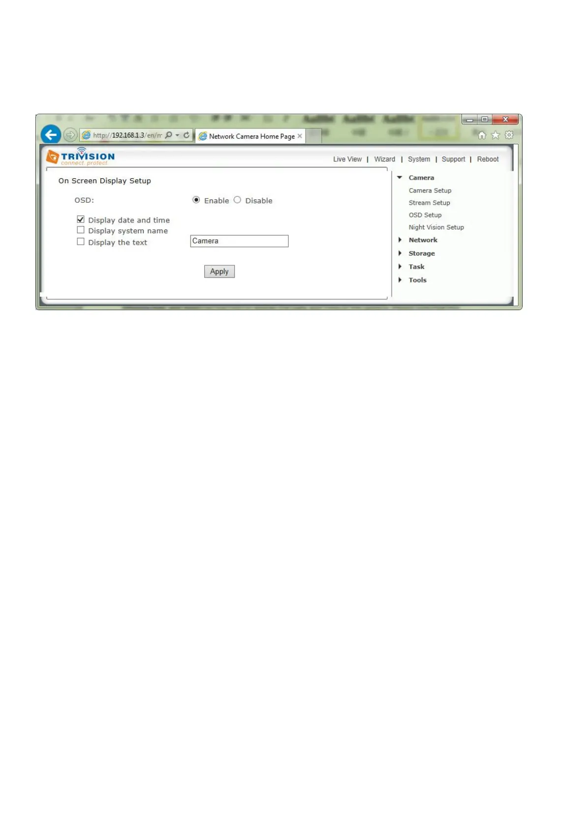 [Display date and time] Set the OSD to display the Date and Time of the camera. Please note that this