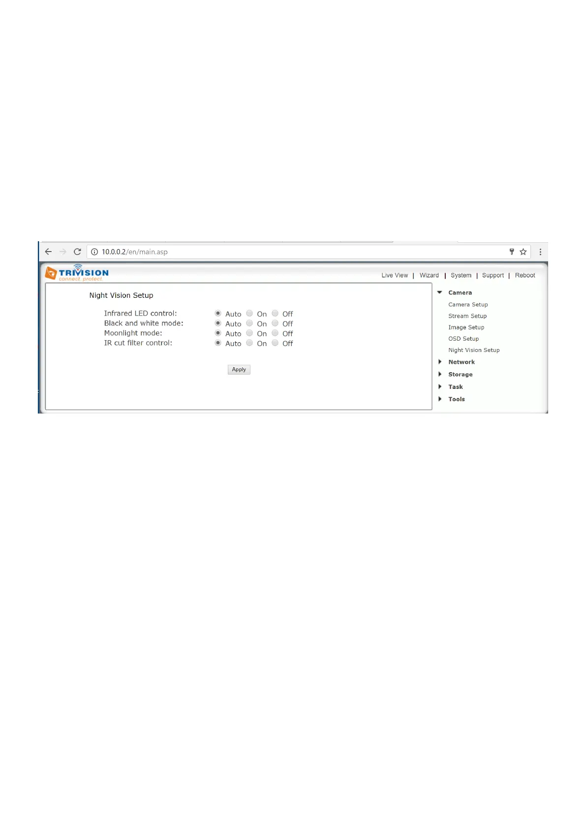 room (resulting in a Black & White mode). When “Off” is selected the IR LEDs are kept in the off state