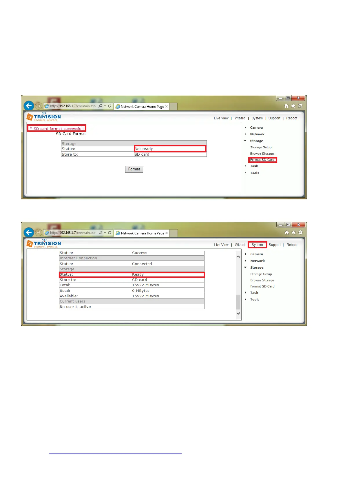 ready” under Format SD card menu. Click “system” menu on the right top of the setting page, the storage