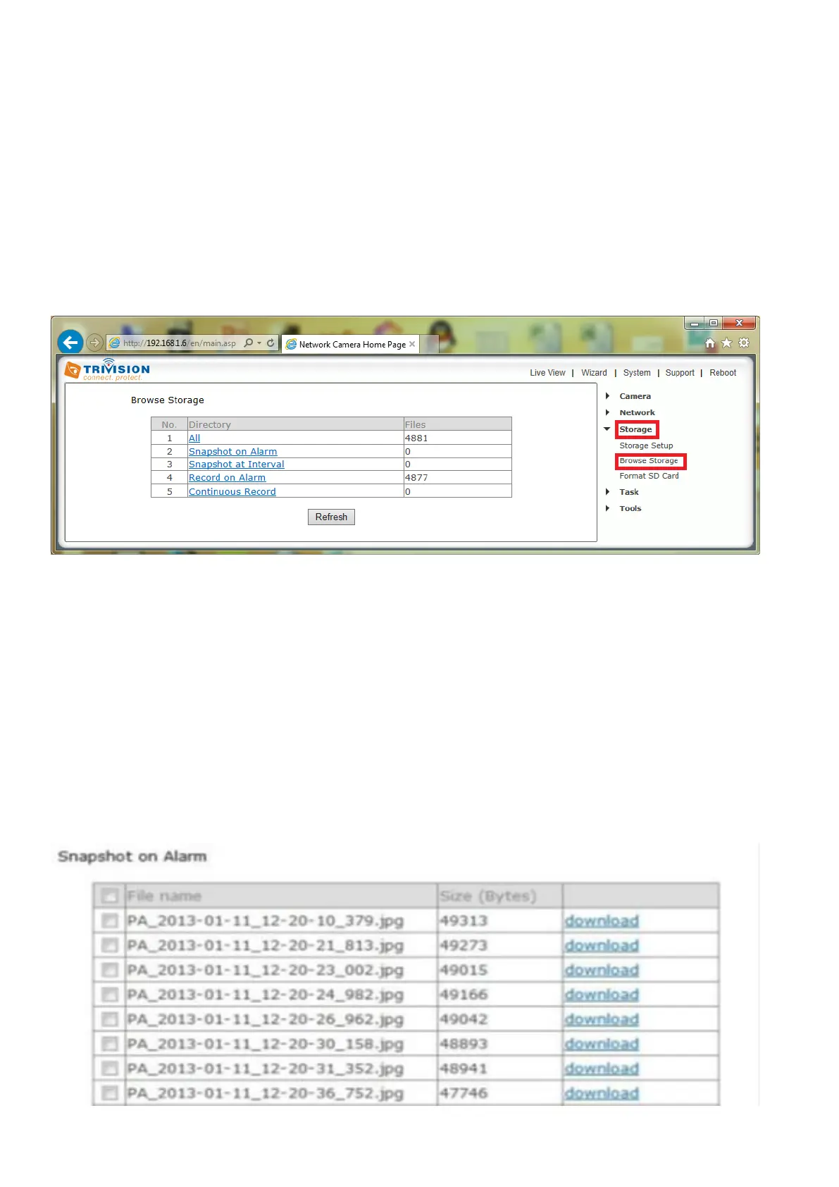 [Snapshot on Alarm] Enables you to view and delete snapshots which were recorded upon motion
