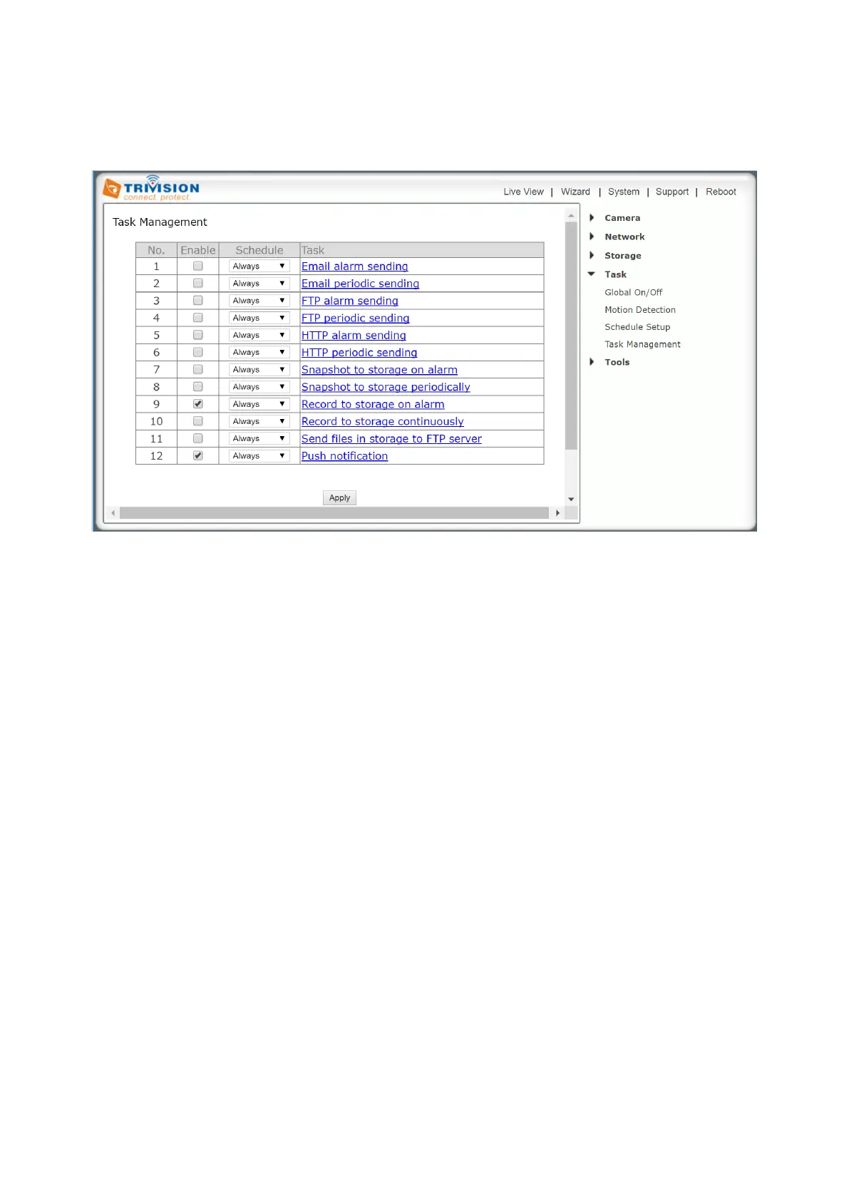 There are various tasks you can enable on your camera. This section will explain the various tasks and their
