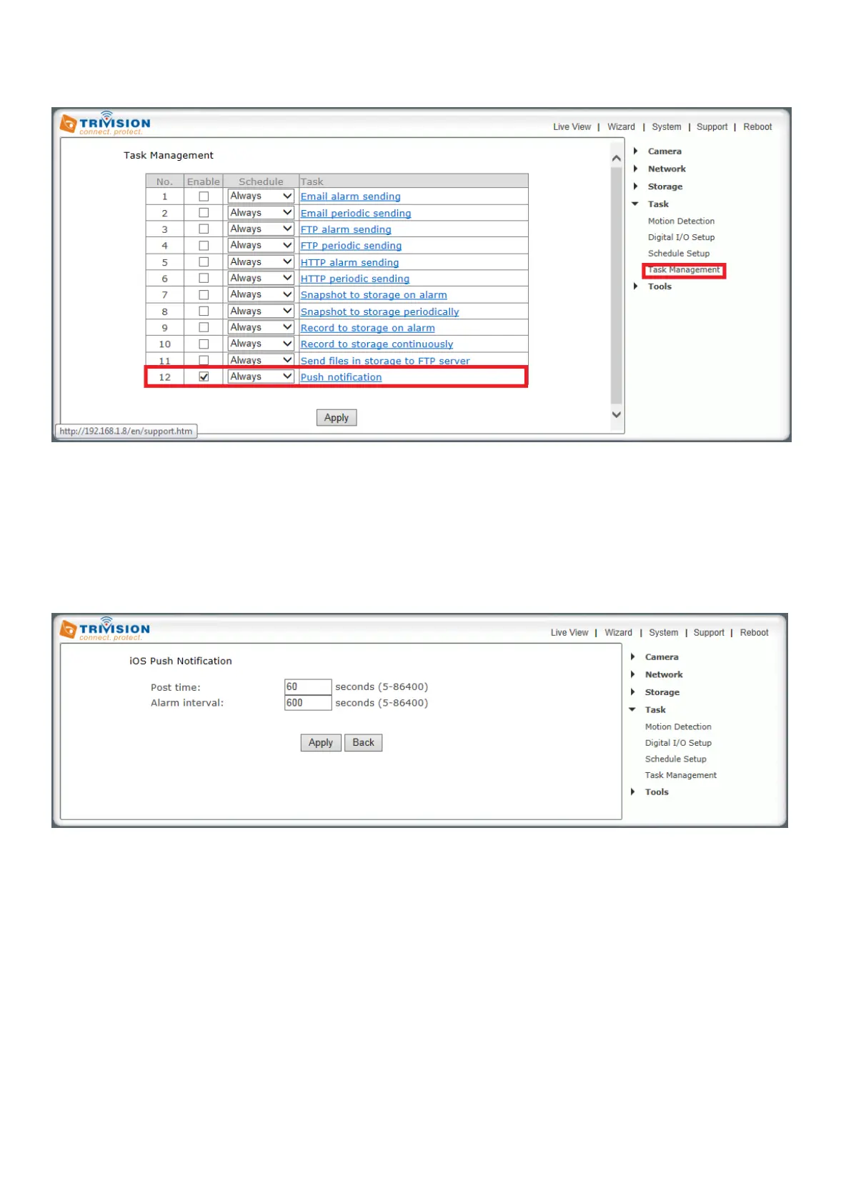 [Post time]--The number of seconds that the camera should keep alarm message sending after motion