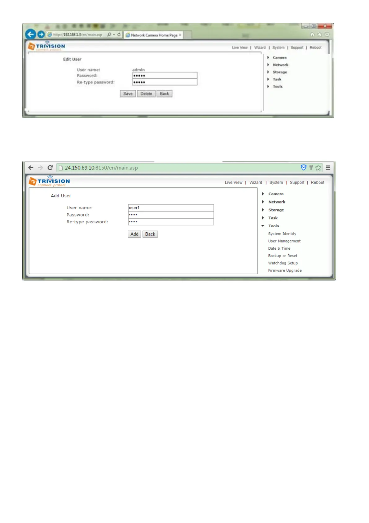 Adding users: Click Add on the Camera User List page, then fill in a username and password (twice) and