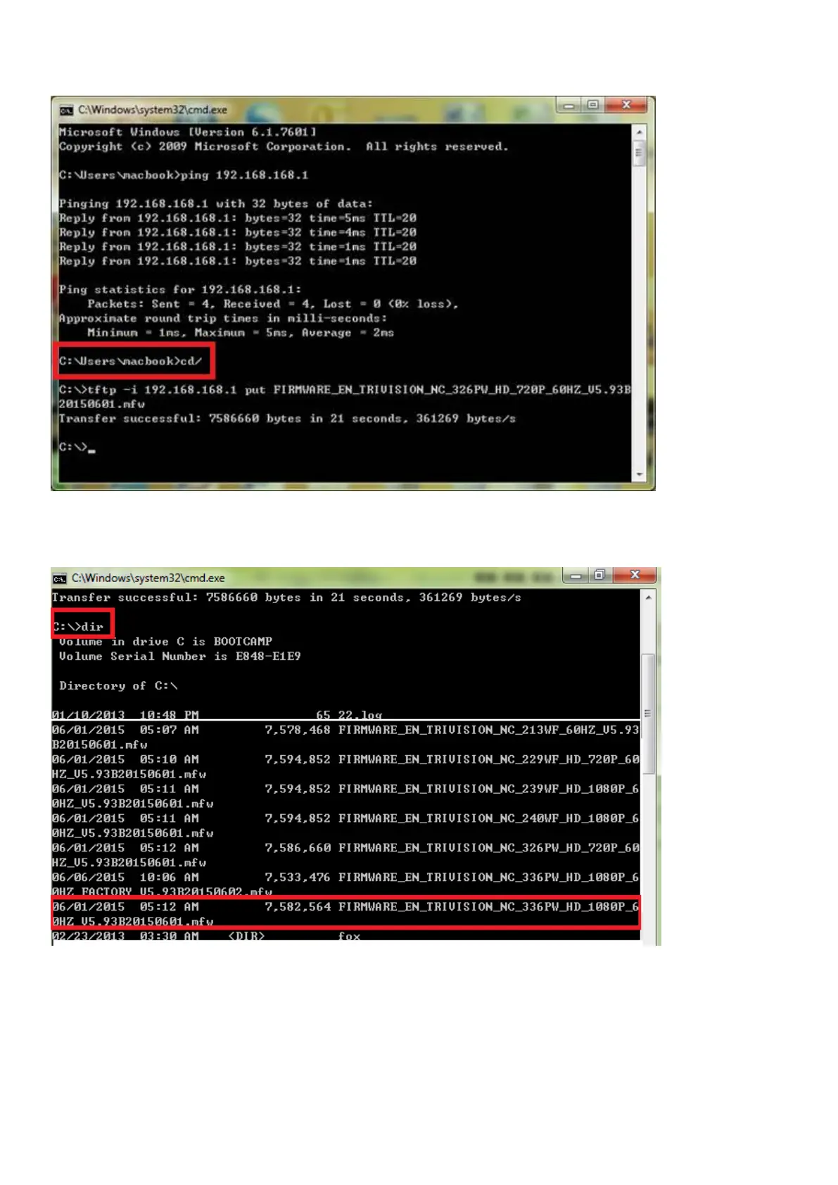 12. Make sure that the firmware.mfw and tftp.exe files are under the same C:\root. Go to the C:\ root and