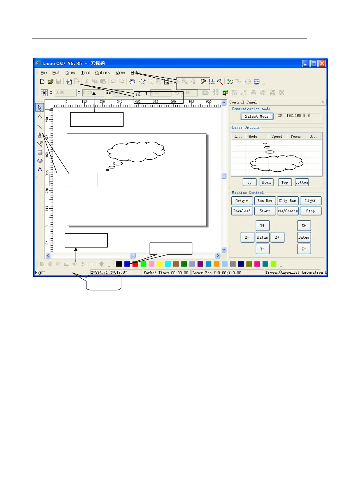 【Control panel】:Use control panel to finish several tasks of laser machining, including setting