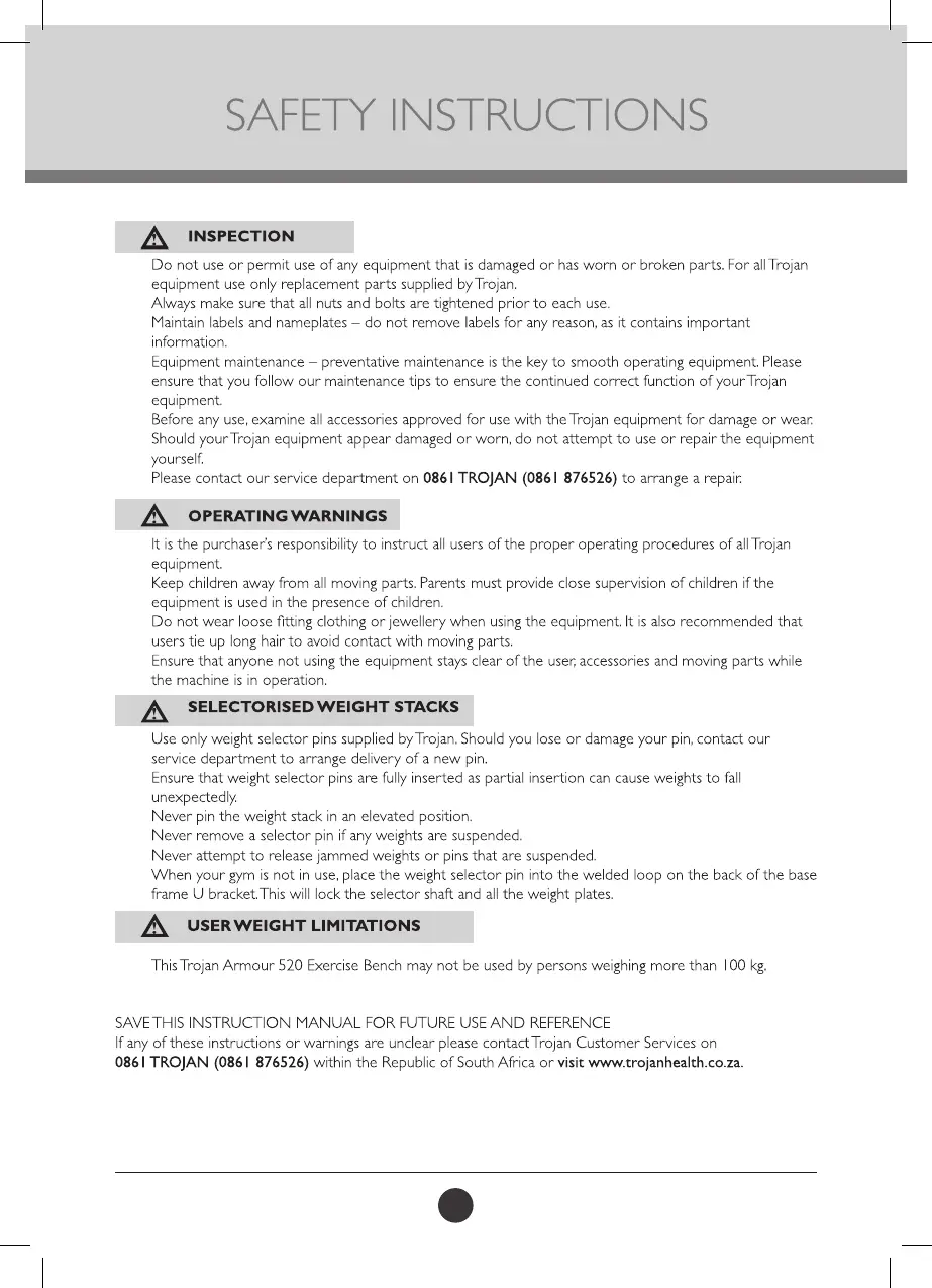 Trojan ARMOUR 520 - Safety Warnings and Limitations; Equipment Inspection; Operating Warnings; Weight Stack Safety