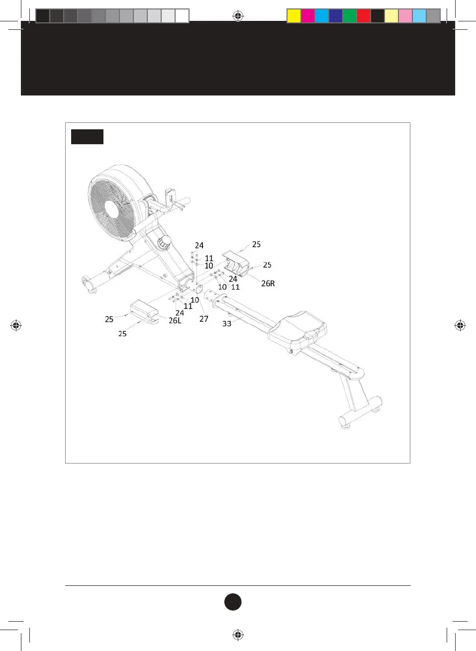 Insert the assembled Steel Rail (33) into Main Frame (27), x it with 6 Arc Washers (10), 6 Spring Washers (11)
