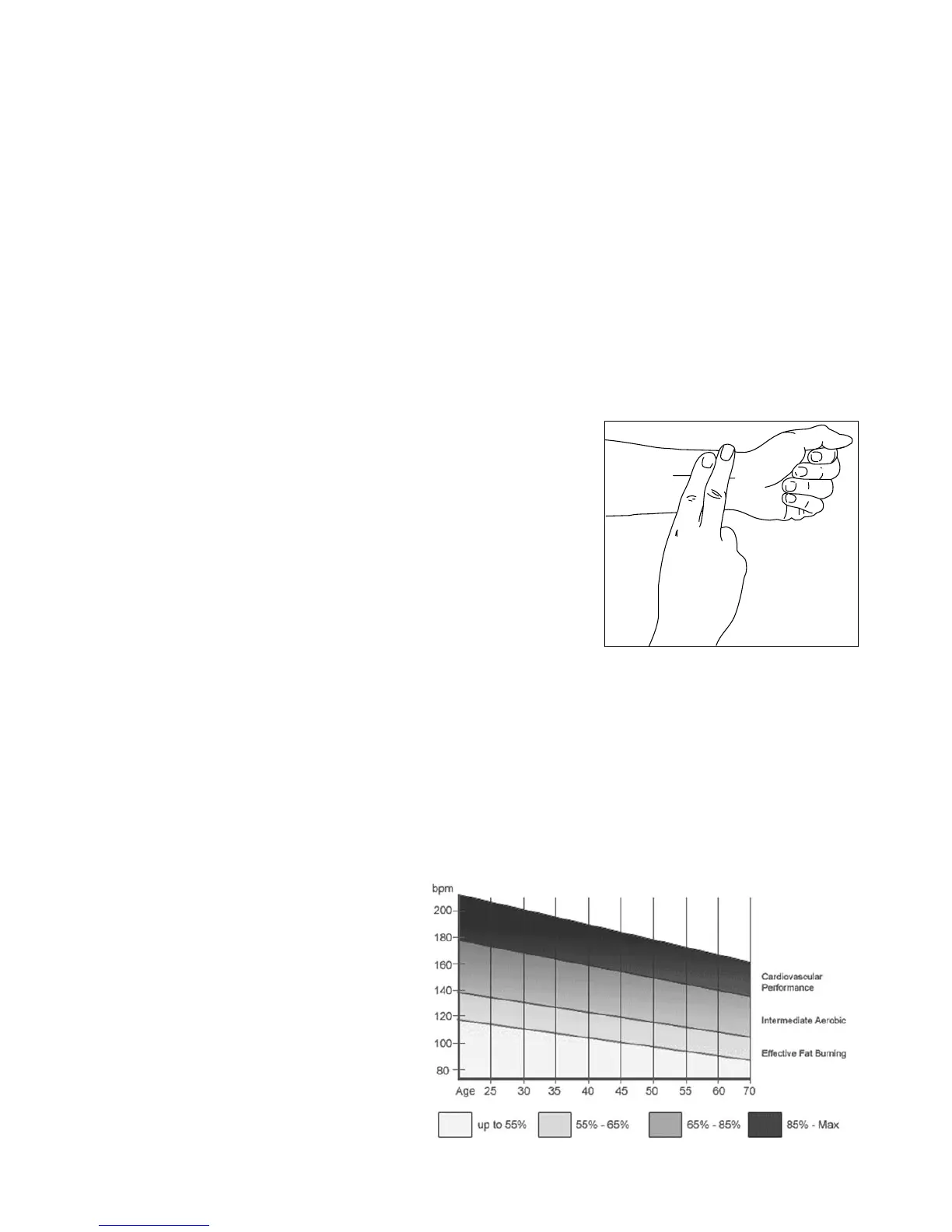 •Monitoryourpulsefrequently.Establishyourtargetheartratebasedonyourageandcondition.