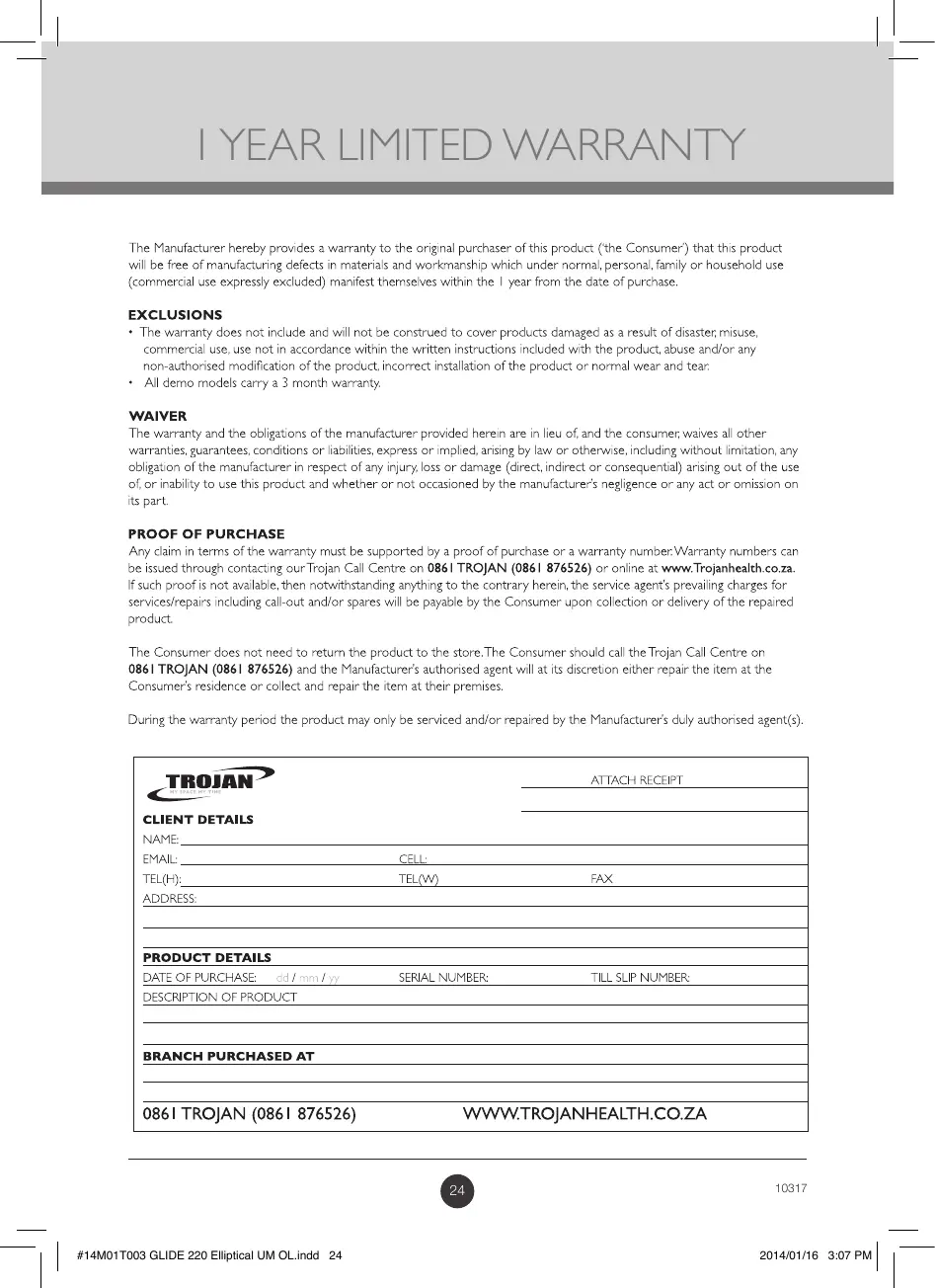 Trojan GLIDE CYCLE 220 - Trojan Glide Cycle 220 Year Limited Warranty Information