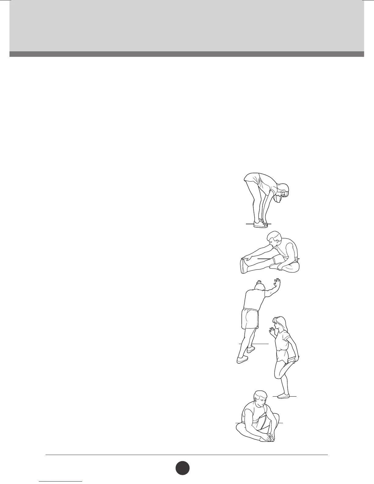Cool-down: 5 to 10 minutes of stretching. This will increase the exibility of your muscles and will help to prevent post-