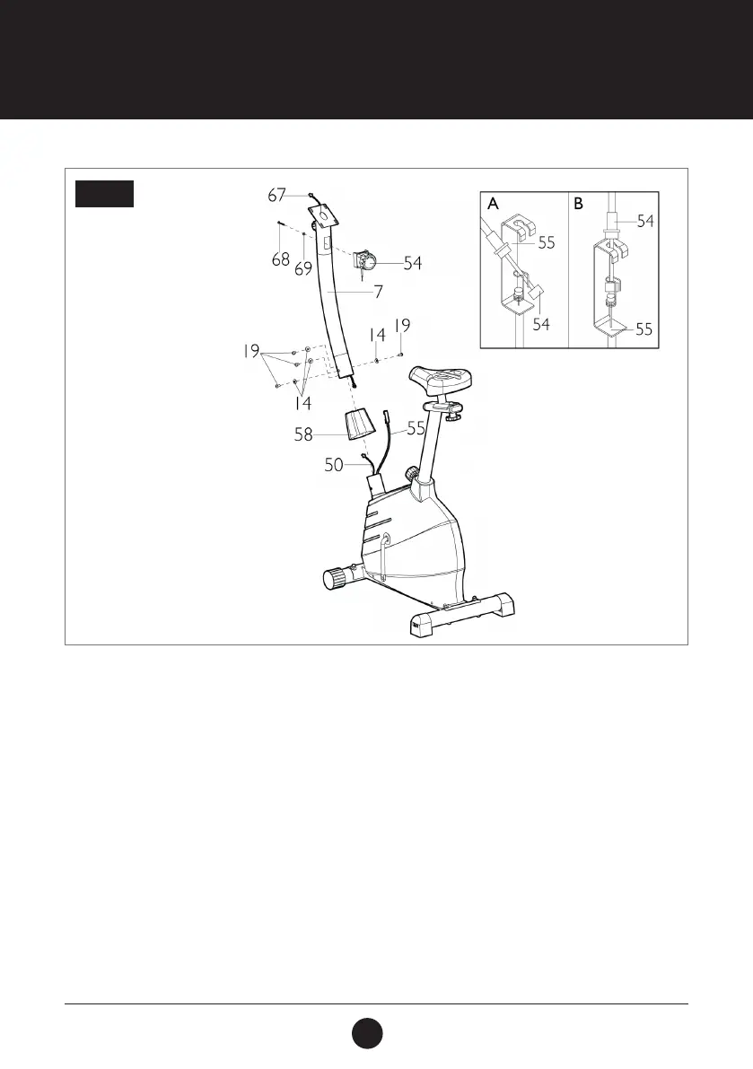 bracket of Tension Cable (L = 1150 mm) (55) as shown in drawing B. Attach the Tension Control Knob (54) onto the